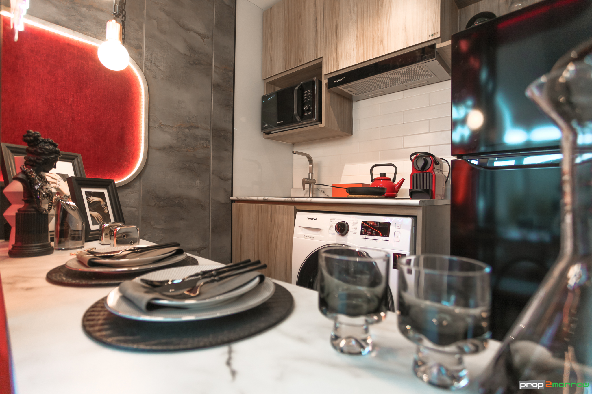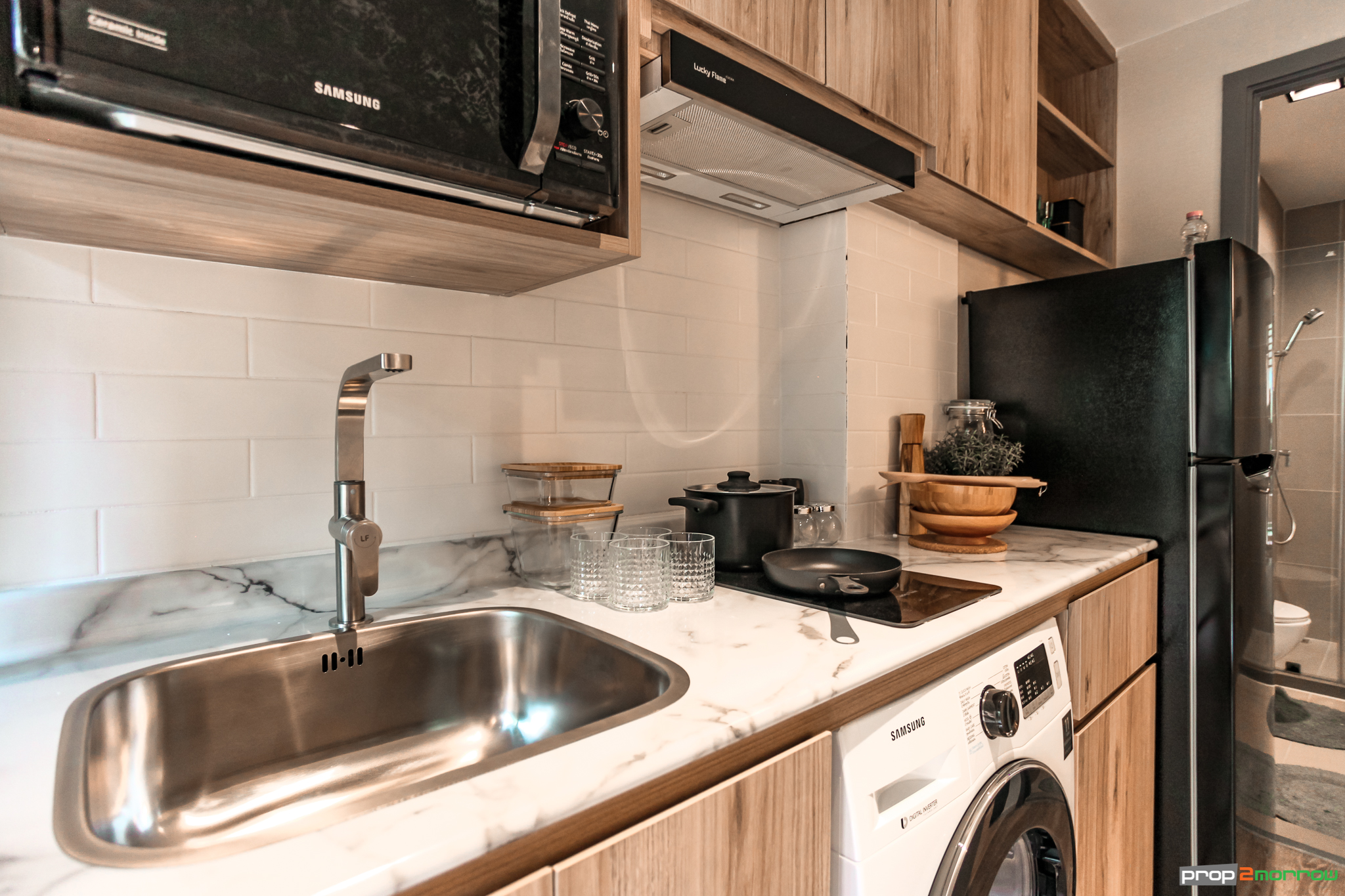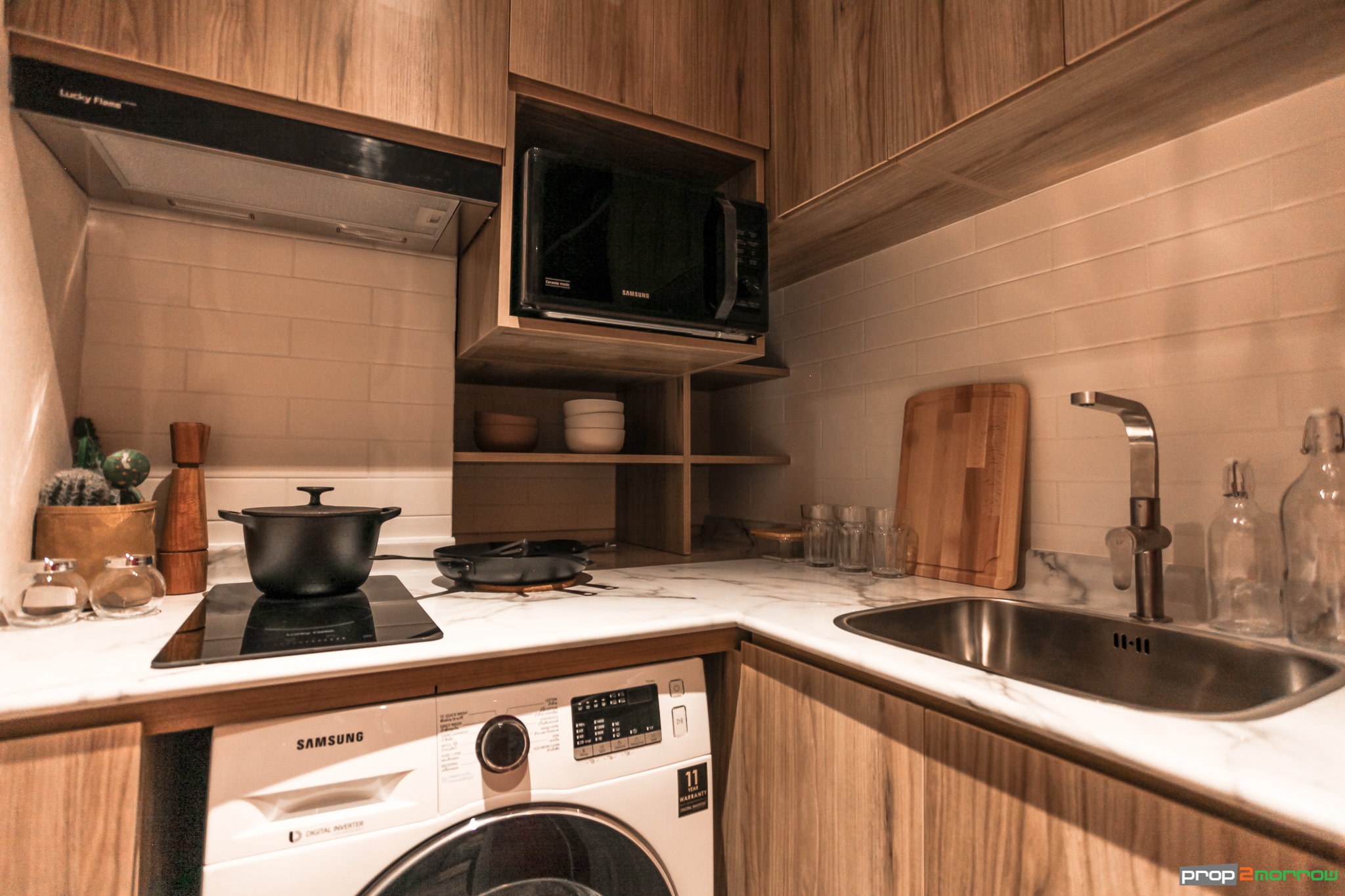 ห้อง STUDIO EXCLUSIVE ขนาดเริ่มต้น 23.75–25.35 ตร.ม. ขึ้นอยู่กับมุมห้อง ต้องบอกว่าห้องเล็กแต่ฟังก์ชันการใช้งานที่โครงการออกแบบมาให้ทำให้ห้องดูไม่เล็ก และแบ่งสัดส่วนการใช้งานได้ดี ไม่เหมือนห้อง Studio ของที่อื่นๆ และที่สำคัญโครงการให้ห้อง Walk-in Closet มาด้วย เริ่มจากเปิดประตูส่วนแรกที่เจอเลยก็คือ Pantry ทางโครงการให้ชุดครัวมาพร้อม Hob Hood Sink สามารถทำอาหารเล็กๆ น้อยๆ หรือแค่อุ่นอาหารเท่านั้น และยังได้ชุดโต๊ะรับประทานอาหารขนาด 2 ที่นั่ง จัดวางเข้ามุมตรงข้ามกับชุดครัวสามารถอุ่นอาหารแล้วมานั่งทานได้