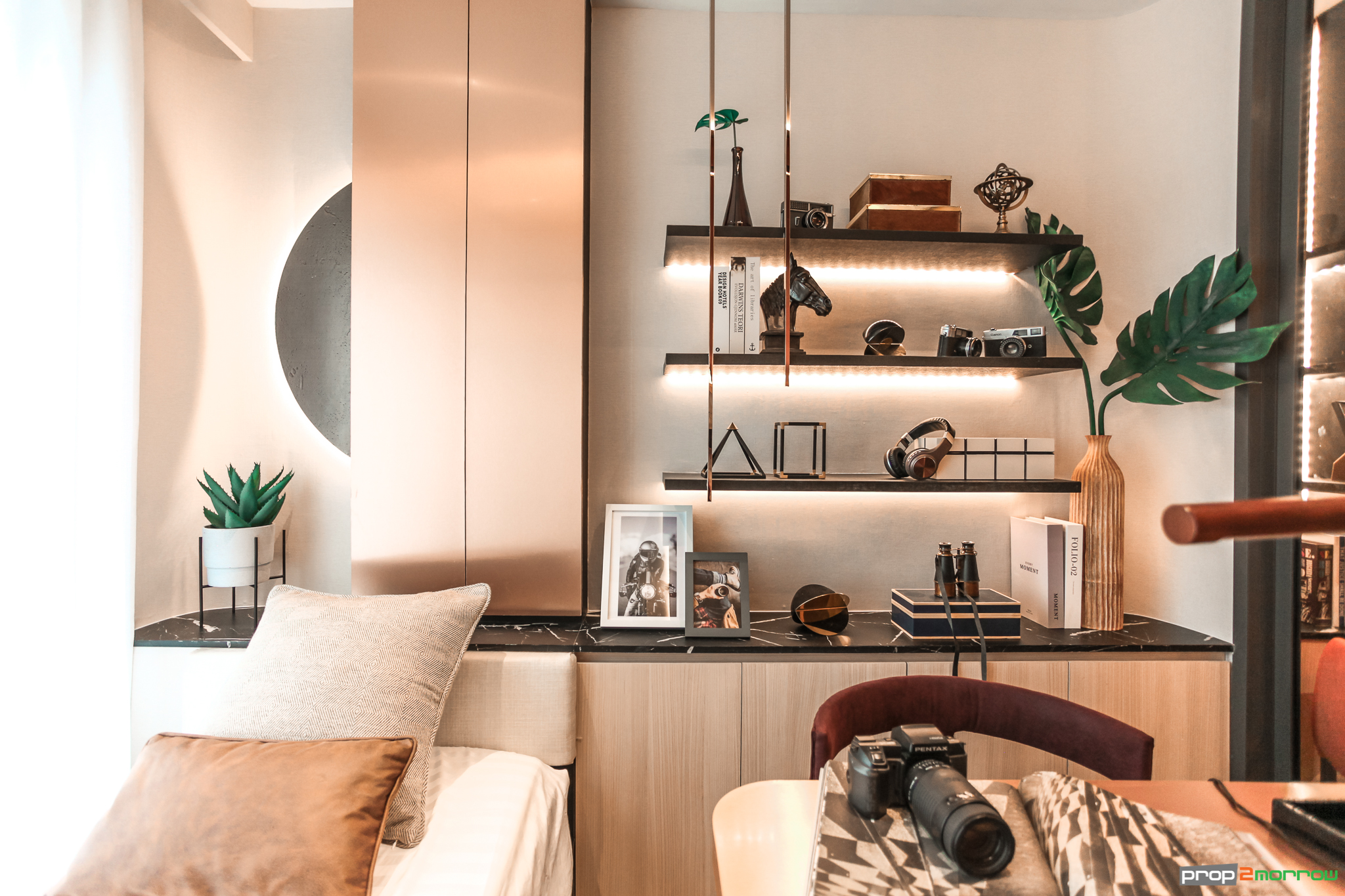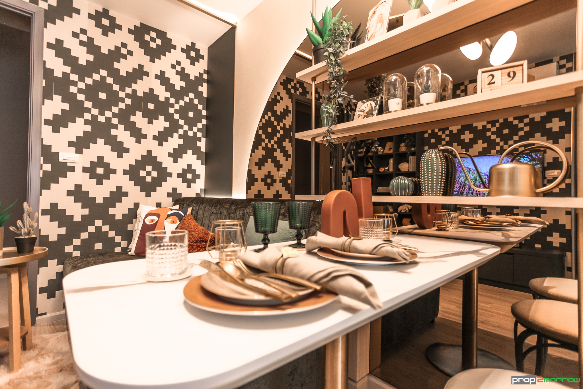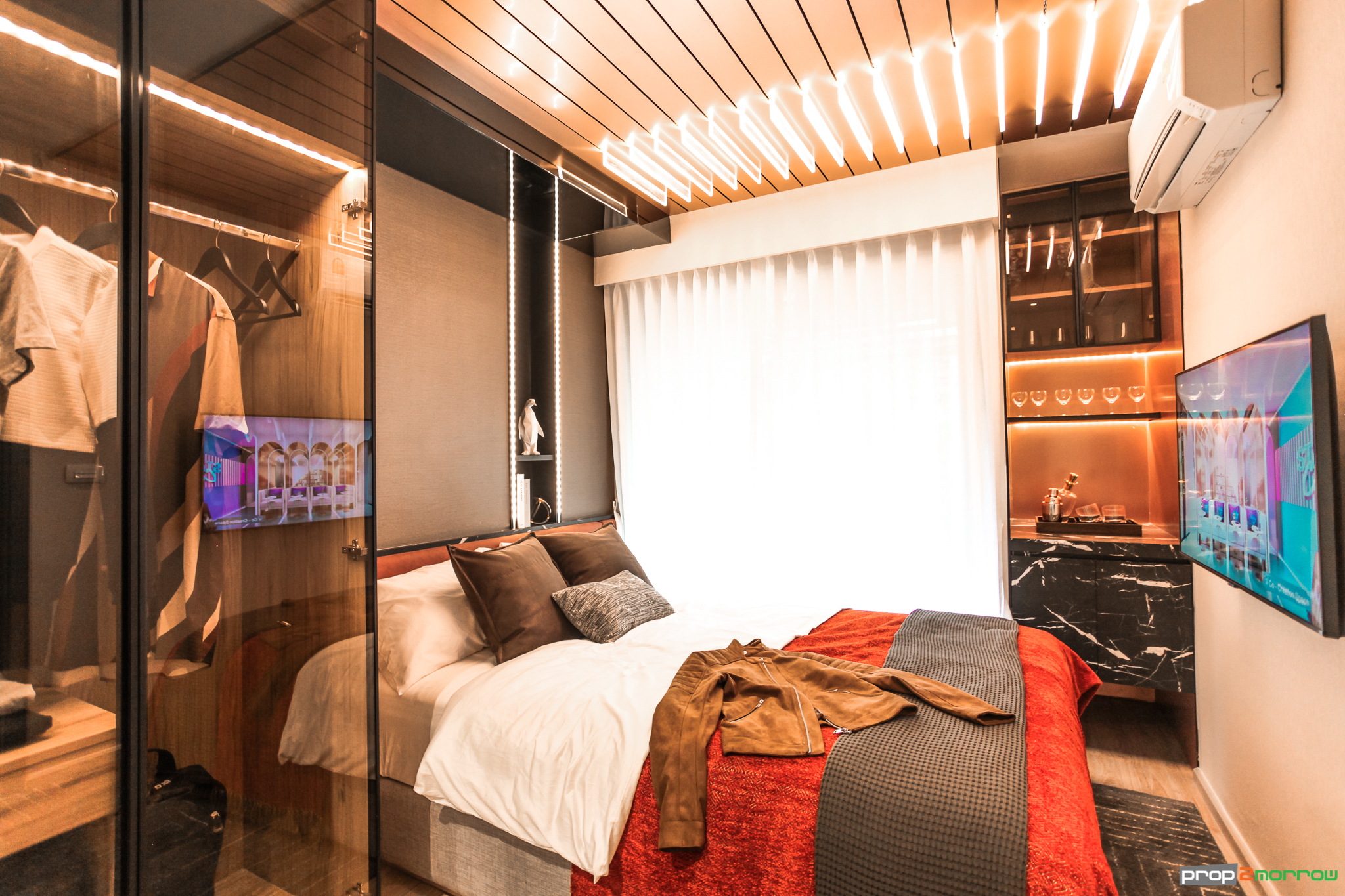 ห้อง STUDIO EXCLUSIVE ขนาดเริ่มต้น 23.75–25.35 ตร.ม. ขึ้นอยู่กับมุมห้อง ต้องบอกว่าห้องเล็กแต่ฟังก์ชันการใช้งานที่โครงการออกแบบมาให้ทำให้ห้องดูไม่เล็ก และแบ่งสัดส่วนการใช้งานได้ดี ไม่เหมือนห้อง Studio ของที่อื่นๆ และที่สำคัญโครงการให้ห้อง Walk-in Closet มาด้วย เริ่มจากเปิดประตูส่วนแรกที่เจอเลยก็คือ Pantry ทางโครงการให้ชุดครัวมาพร้อม Hob Hood Sink สามารถทำอาหารเล็กๆ น้อยๆ หรือแค่อุ่นอาหารเท่านั้น และยังได้ชุดโต๊ะรับประทานอาหารขนาด 2 ที่นั่ง จัดวางเข้ามุมตรงข้ามกับชุดครัวสามารถอุ่นอาหารแล้วมานั่งทานได้