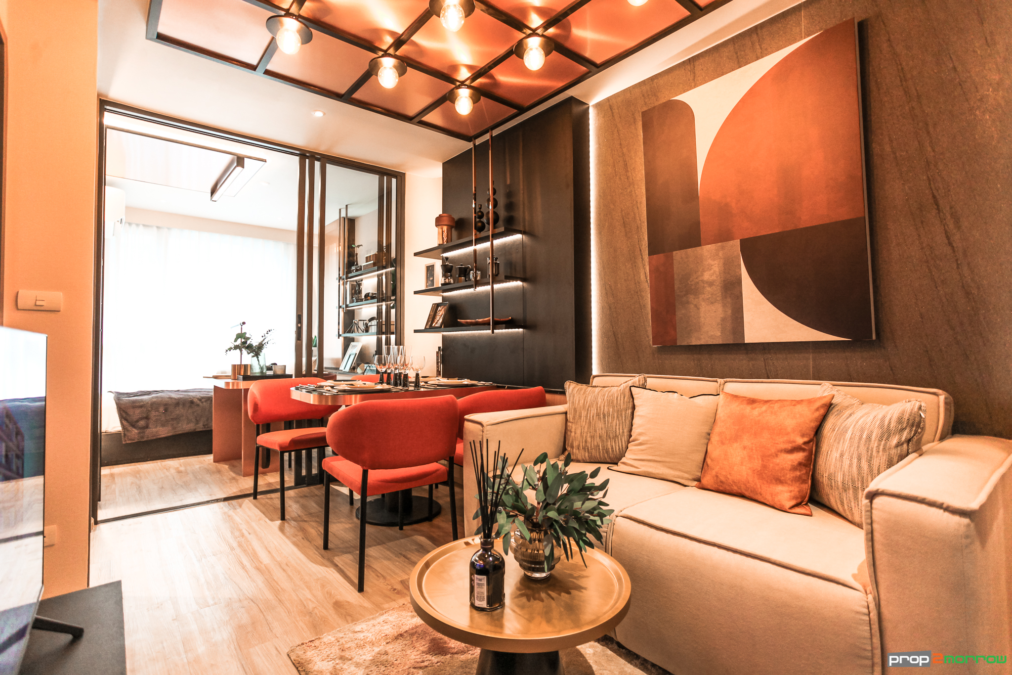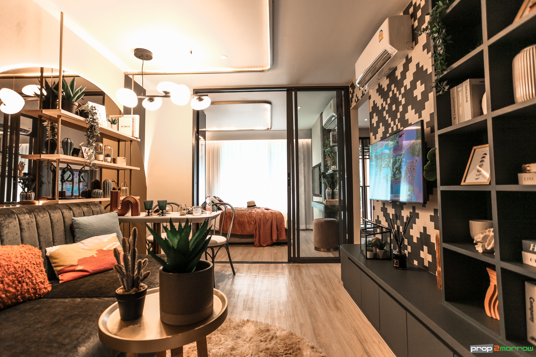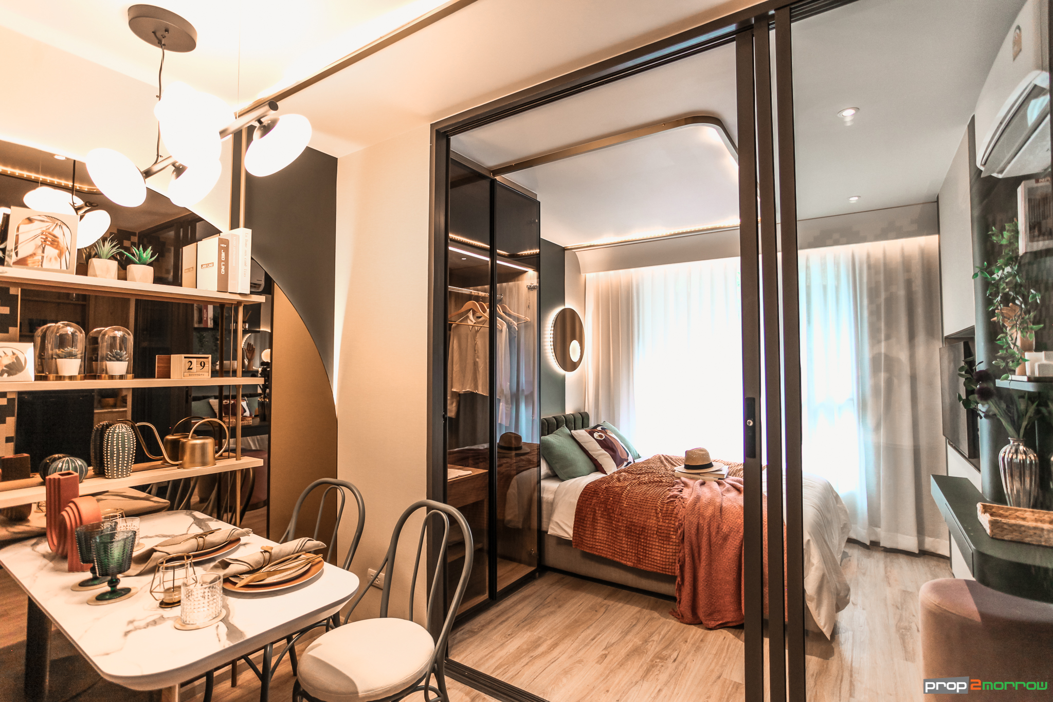 ห้องขนาด 1 ห้องนอน ขนาด 27.95-28.85 ตร.ม. เป็นห้องที่แบ่งสัดส่วนการใช้งานได้อย่างลงตัว เริ่มจากส่วนแรกเปิดเข้าไปเป็นส่วนของ Living Space และมุมรับประทานอาหาร และกั้นส่วน Living Space และห้องนอนด้วยประตูบานสไลด์ เพิ่มความเป็นสัดส่วนเวลาเพื่อนมาบ้านก็สามารถเลื่อนประตูบานสไลด์กั้น หรือหากอยู่ 2 คน คนหนึ่งอยากนอน อีกคนจะดูทีวี ก็เลื่อนประตูปิดไม่รบกวนกัน