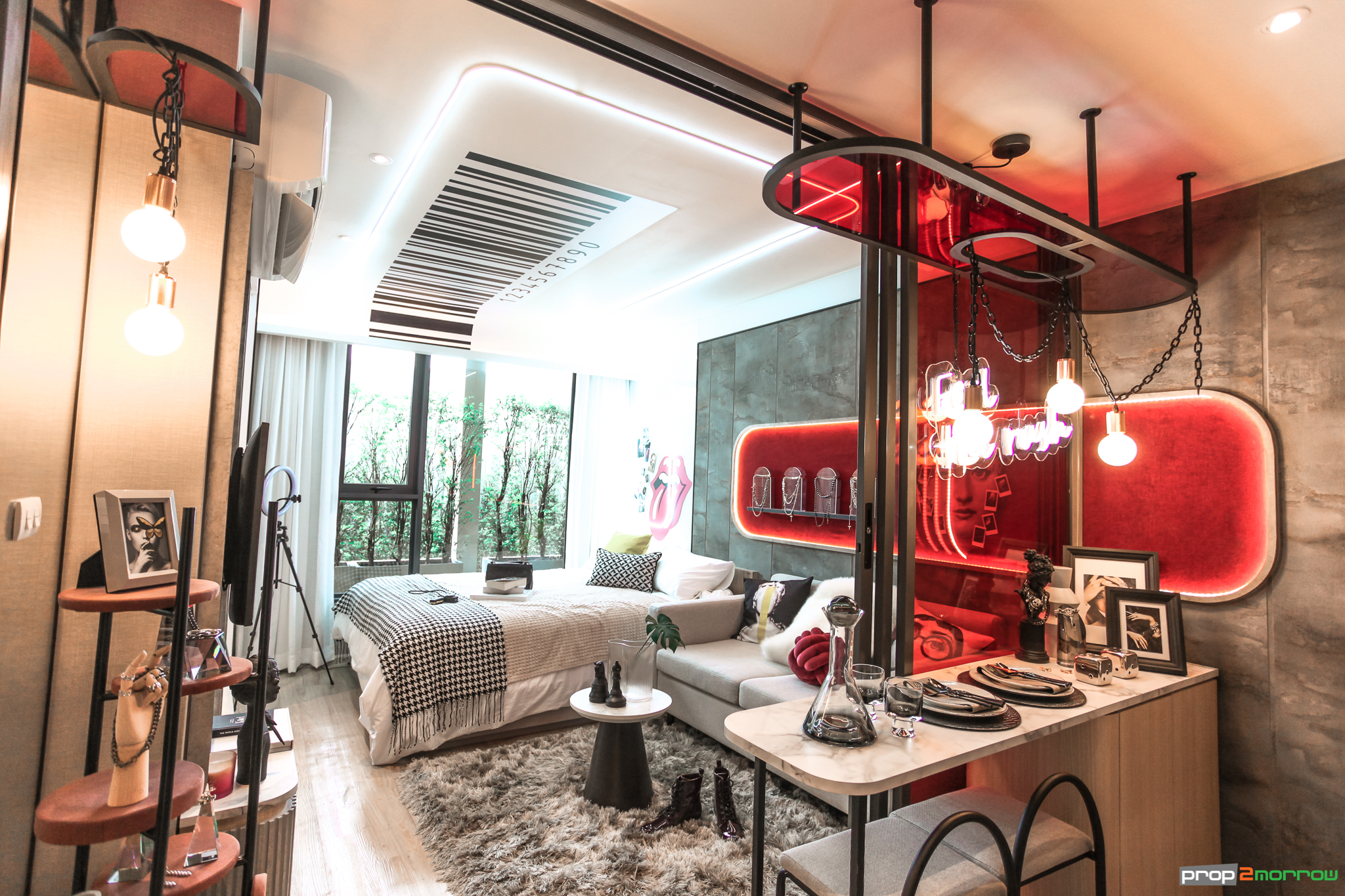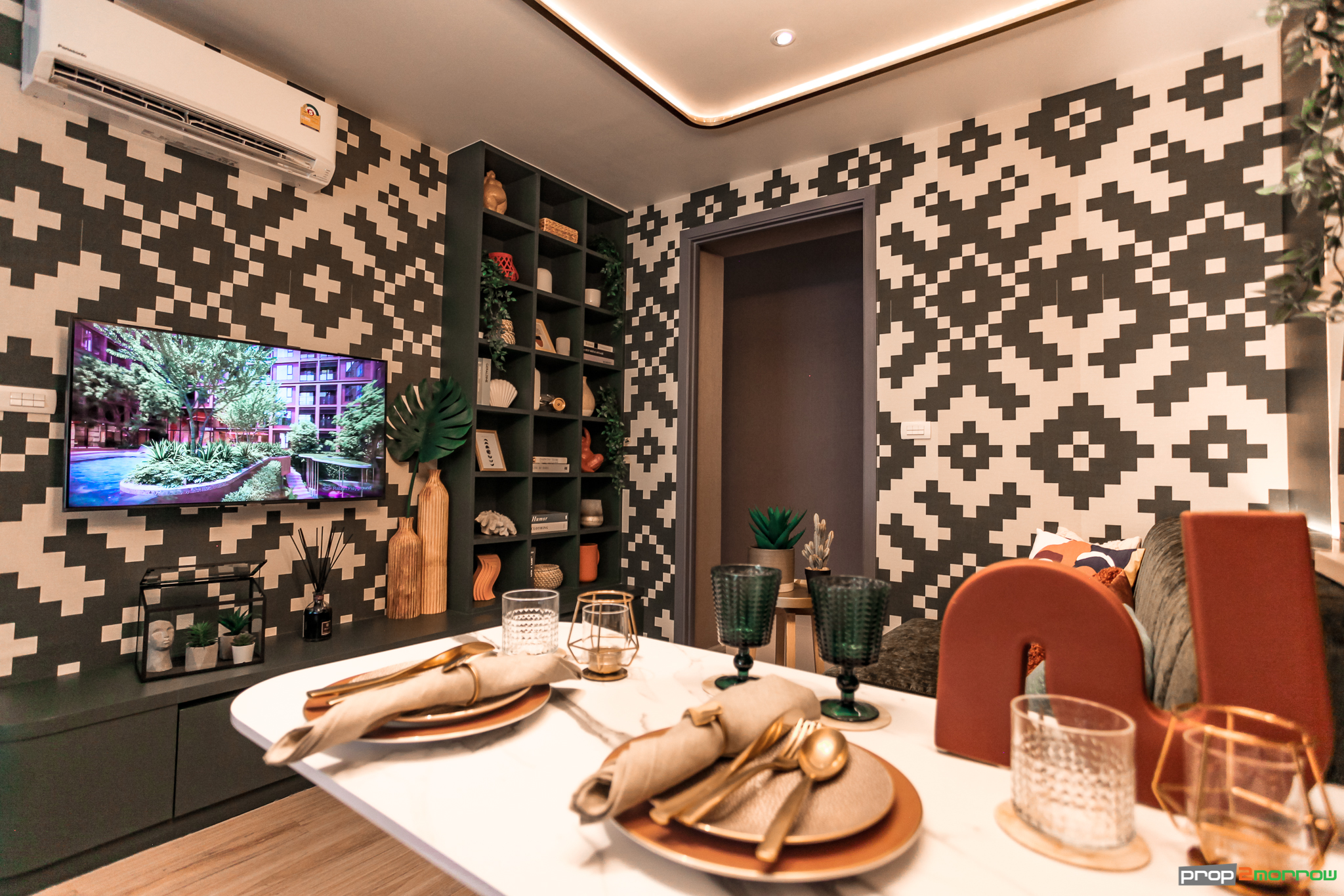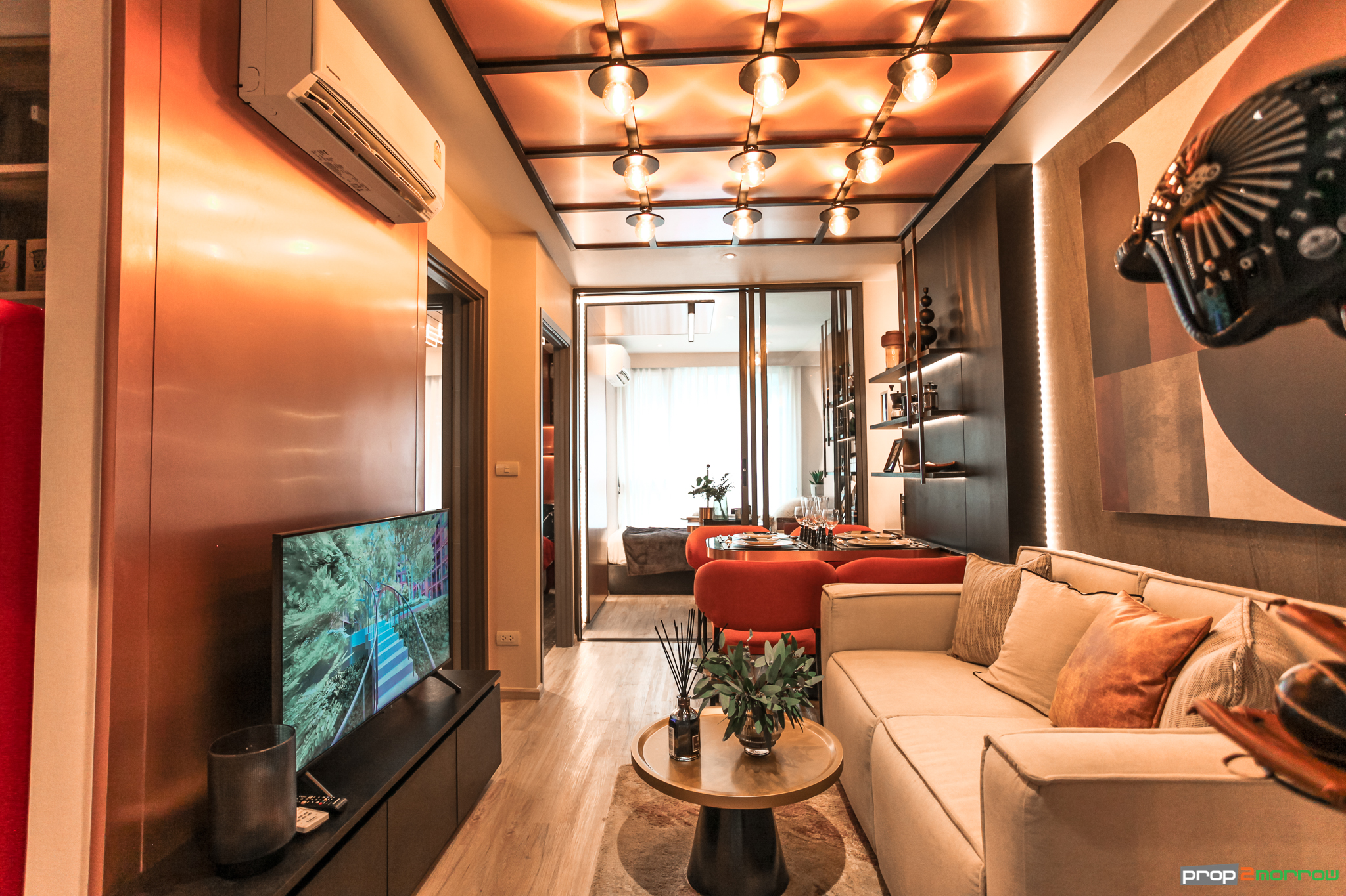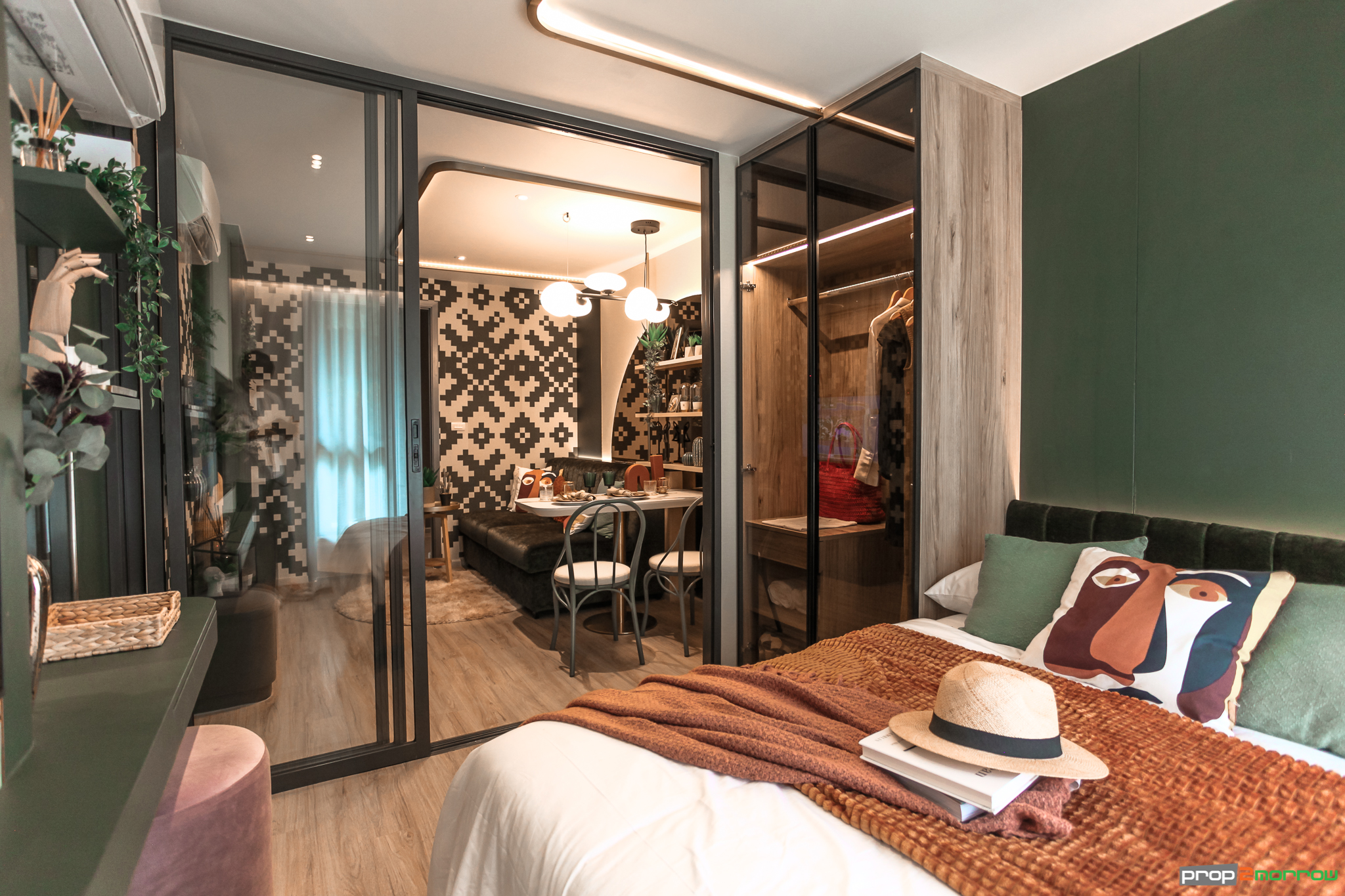 ห้องขนาด 1 ห้องนอน ขนาด 27.95-28.85 ตร.ม. เป็นห้องที่แบ่งสัดส่วนการใช้งานได้อย่างลงตัว เริ่มจากส่วนแรกเปิดเข้าไปเป็นส่วนของ Living Space และมุมรับประทานอาหาร และกั้นส่วน Living Space และห้องนอนด้วยประตูบานสไลด์ เพิ่มความเป็นสัดส่วนเวลาเพื่อนมาบ้านก็สามารถเลื่อนประตูบานสไลด์กั้น หรือหากอยู่ 2 คน คนหนึ่งอยากนอน อีกคนจะดูทีวี ก็เลื่อนประตูปิดไม่รบกวนกัน