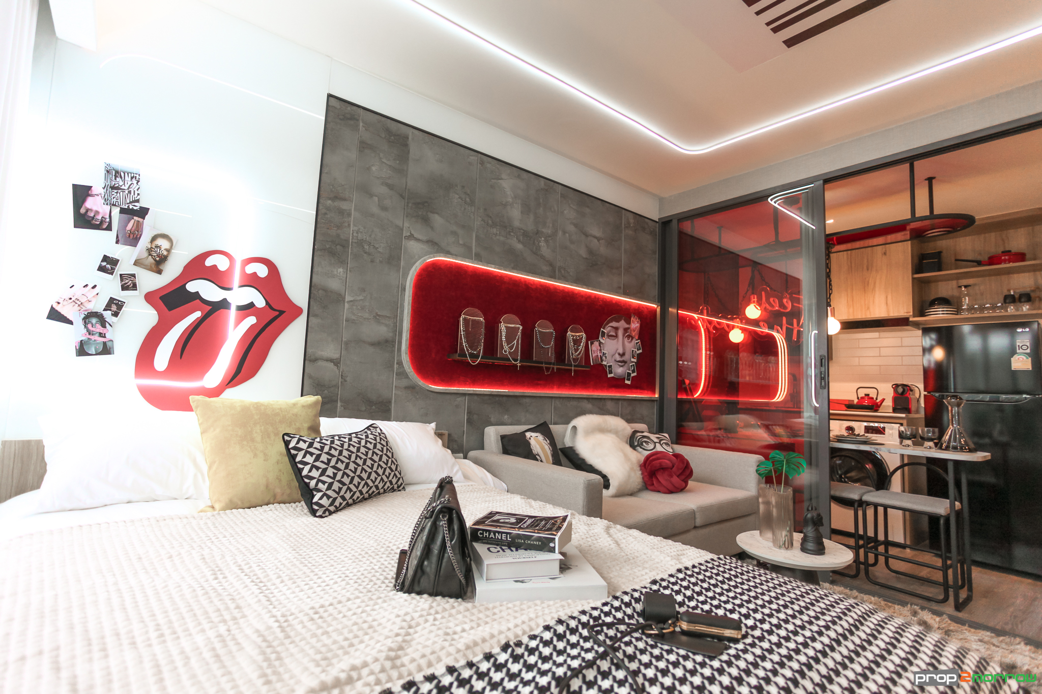 และแบ่งกันระหว่างส่วน Pantry กับห้องนอนด้วยกระจกบานสไลด์ 3 ตอน ทำให้เป็นสัดส่วน และป้องกันไม่ให้กลิ่นอาหารเข้าไปรบกวนส่วนห้องนอน