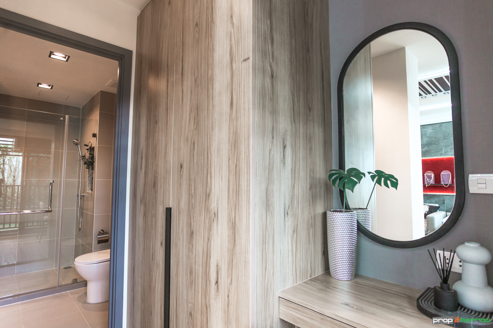 ทางด้านซ้ายมือของ Pantry เป็นห้องน้ำ ห้องน้ำสามารถเข้าออกได้ 2 ทาง อีกทางจะเป็นส่วนของ Walk in Closet ที่ทางโครงการบิ้วอินตู้เสื้อผ้า ขนาดเต็มบานมาให้ จุดนี้ดีมากๆ น่าจะถูกใจสาวๆ สายแฟชั่น หรือหนุ่มๆ ยุคนี้เองก็มีเครื่องแต่งตัวไม่แพ้สาวๆ เลย