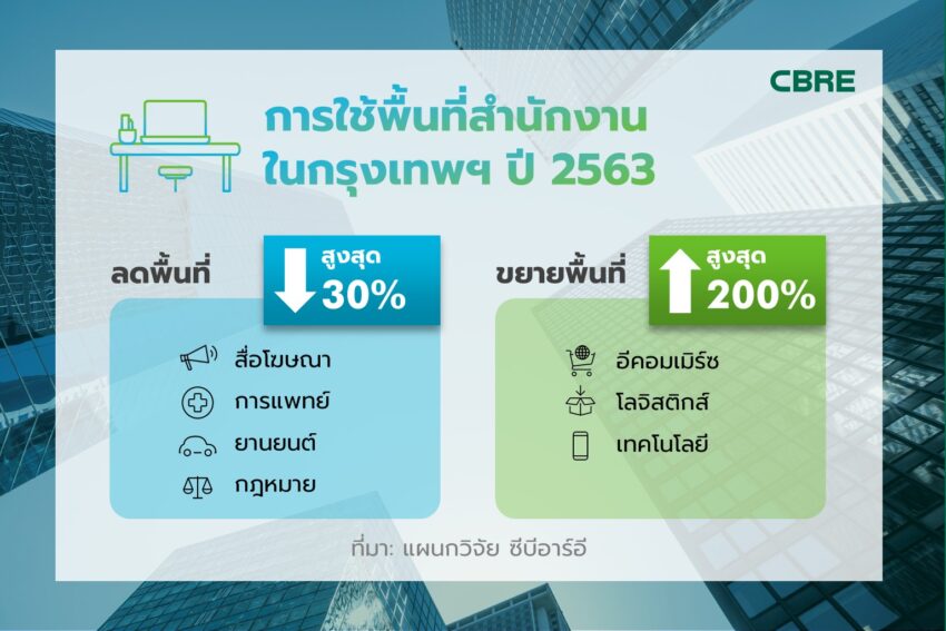 ด้านนางสาวรุ่งรัตน์ วีระภาคย์การุณ หัวหน้าแผนกพื้นที่สำนักงาน บริษัท ซีบีอาร์อี (ประเทศไทย) จำกัด กล่าวว่า ในภาวะเศรษฐกิจเช่นปี 2563 ตลาดอาคารสำนักงานในกรุงเทพมหานครเกิดมีการควบรวมพื้นที่หรือลดขนาดพื้นที่สำนักงานสูงสุด 30% โดยเป็นพื้นที่สำนักงานของบางกลุ่มธุรกิจอย่างโฆษณา การแพทย์ ยานยนต์ และกฎหมาย ในทางตรงกันข้าม ธุรกิจอี-คอมเมิร์ซและโลจิสติกส์กลับมีการขยายพื้นที่สำนักงานสูงสุดถึง 100% และสูงสุดถึง 200% สำหรับบริษัทด้านแพลตฟอร์มเทคโนโลยี ซึ่งเป็นผลจากการเติบโตอย่างรวดเร็วของธุรกิจออนไลน์ในปีที่แล้ว