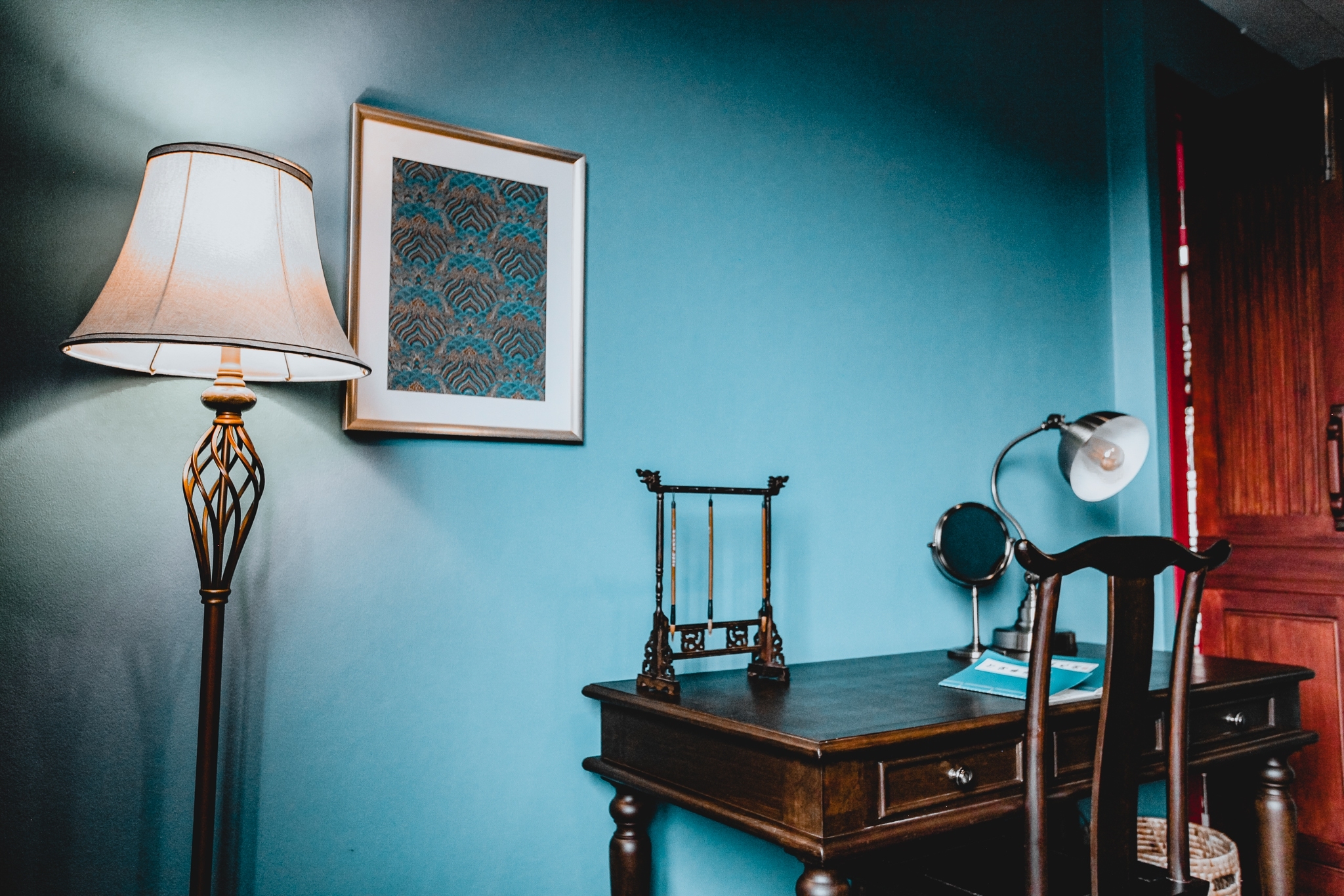 โถงบันไดทางขึ้น แต่งด้วยโคมเตงลั้งสีแดง เข้ากับฉากหลังสวยงามสะดุดตา