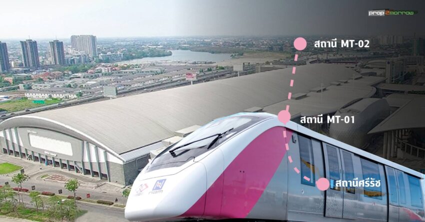 สำหรับแนวเส้นทางของรถไฟฟ้าสายสีชมพู ส่วนต่อขยายช่วงสถานีศรีรัช – เมืองทองธานี ระยะทาง 2.8 กิโลเมตร มีจุดเริ่มต้นจากถนนแจ้งวัฒนะ บริเวณสถานีศรีรัชของโครงการรถไฟฟ้าสายสีชมพู ช่วงแคราย – มีนบุรี เข้าสู่เมืองทองธานี วิ่งไปตามซอยแจ้งวัฒนะ – ปากเกร็ด 39 แนวทางเดียวกันกับทางพิเศษอุดรรัถยา(ทางด่วนสายบางปะอิน-ปากเกร็ด) ต่อเนื่องไปสิ้นสุดโครงการบริเวณทะเลสาบเมืองทองธานี ระยะ มีสถานีรถไฟฟ้าให้บริการ 2 สถานี คือ สถานี MT-01 บริเวณหน้าอาคารอิมแพ็คชาเลนเจอร์ และสถานีMT-02 บริเวณด้านหน้าของทะเลสาบเมืองทองธานี ใกล้กับเอส ซีจี สเตเดี้ยม ครอบคลุมพื้นที่บางส่วนของตำบลบางตลาด คลองเกลือ และตำบลบ้านใหม่ ของเทศบาลนครปากเกร็ด