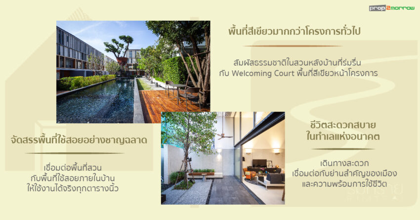 โดยบ้านทั้ง 55 หลังในโครงการจะมีความเป็น Private Living และ Urban Courtyard เพื่อเป็นพื้นที่ส่วนตัวของแต่ละครอบครัว นอกจากความสวยงามของสวนสวย การออกแบบบ้านที่เปิดโล่งให้อากาศไหลเวียนในบ้านได้ดี หลังคาบ้านและผนังที่ออกแบบด้วยวัสดุจากธรรมชาติ เรียบง่าย แต่มีคุณค่าได้ไม่ว่าเวลาจะผ่านไปนานแค่ไหนก็ตาม เป็นชีวิตในแนวทาง Eco-Friendly ที่คนเมืองในปัจจุบันต้องการ