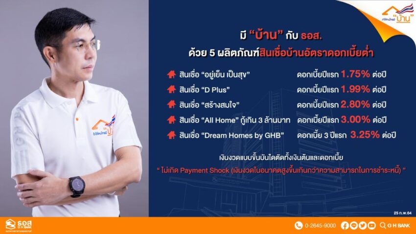 5.โครงการสินเชื่อบ้าน Dream Homes by GHB กรอบวงเงิน 7,500 ล้านบาท สำหรับลูกค้าที่ไม่มีการผ่อนชำระสินเชื่อที่อยู่อาศัย กับ ธอส. และสถาบันการเงินอื่น ให้กู้เพื่อซื้อ ปลูกสร้าง หรือเพื่อซื้อที่ดินพร้อมปลูกสร้าง อัตราดอกเบี้ยปีที่ 1-3 เท่ากับ 3.25% ต่อปี ปีที่ 4-5 เท่ากับ 4.15% ต่อปี กรณีกู้ 1 ล้านบาท ผ่อนชำระเริ่มต้นเพียง 3,500 บาทต่อเดือน ยื่นคำขอกู้ตั้งแต่วันนี้ถึงวันที่ 30 มิถุนายน 2564 อนุมัติและทำนิติกรรมภายในวันที่ 30 กรกฎาคม 2564
