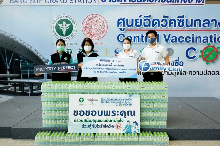 นางสาวจิตราวดี เสนจันทร์ฒิไชย (ที่ 2 จากขวา)รองผู้อำนวยการ ฝ่ายบริหารงานขาย ในฐานะผู้แทน บริษัท พร็อพเพอร์ตี้ เพอร์เฟค จำกัด (มหาชน) หรือPF พร้อมเป็นส่วนหนึ่งที่ร่วมให้ความช่วยเหลือ แก่สังคมไทยจากสถานการณ์โควิด-19 ได้ส่งมอบน้ำดื่มจำนวน 10,000 ขวด เพื่อสนับสนุนการทำงานและเป็นกำลังใจให้แก่บุคลากรทางการแพทย์ ตลอดจนการแจกจ่ายให้กับประชาชนที่เข้ามารับบริการ ฉีดวัคซีนในการสร้างภูมิคุ้มกันหมู่ด้วย ณ ศูนย์ฉีดวัคซีนกลางบางซื่อ เมื่อเร็วๆนี้