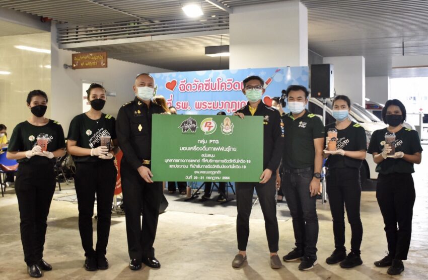 นายอนันต์ รัตนมั่นคง (ที่ 4 จากขวา) ผู้ช่วยผู้อำนวยการฝ่ายปฏิบัติการ บริษัทกาแฟพันธุ์ไทย จำกัด ในกลุ่ม บริษัท พีทีจี เอ็นเนอยี จำกัด (มหาชน) หรือ PTG มอบเครื่องดื่มกาแฟพันธุ์ไทย เพื่อสนับสนุนการทำงานและเป็นกำลังใจให้แก่บุคลากรทางการแพทย์ ที่ให้บริการฉีดวัคซีนโควิด-19 ตลอดจนประชาชน ที่เข้ารับบริการฉีดวัคซีนโควิด-19 ในการสร้างภูมิคุ้มกันหมู่ ภายในศูนย์ฉีดวัคซีนโควิด-19 รพ.พระมงกุฎเกล้า โดยมี พันเอก รชต ลำกูล (ที่ 3 จากซ้าย) รองผู้อำนวยการโรงพยาบาลพระมงกุฎเกล้า ณ ชั้น 1 อาคารเฉลิมพระเกียรติสมเด็จพระนางเจ้าฯ พระบรมราชินีนาถ โรงพยาบาลพระมงกุฎเกล้า เมื่อเร็วๆ นี้