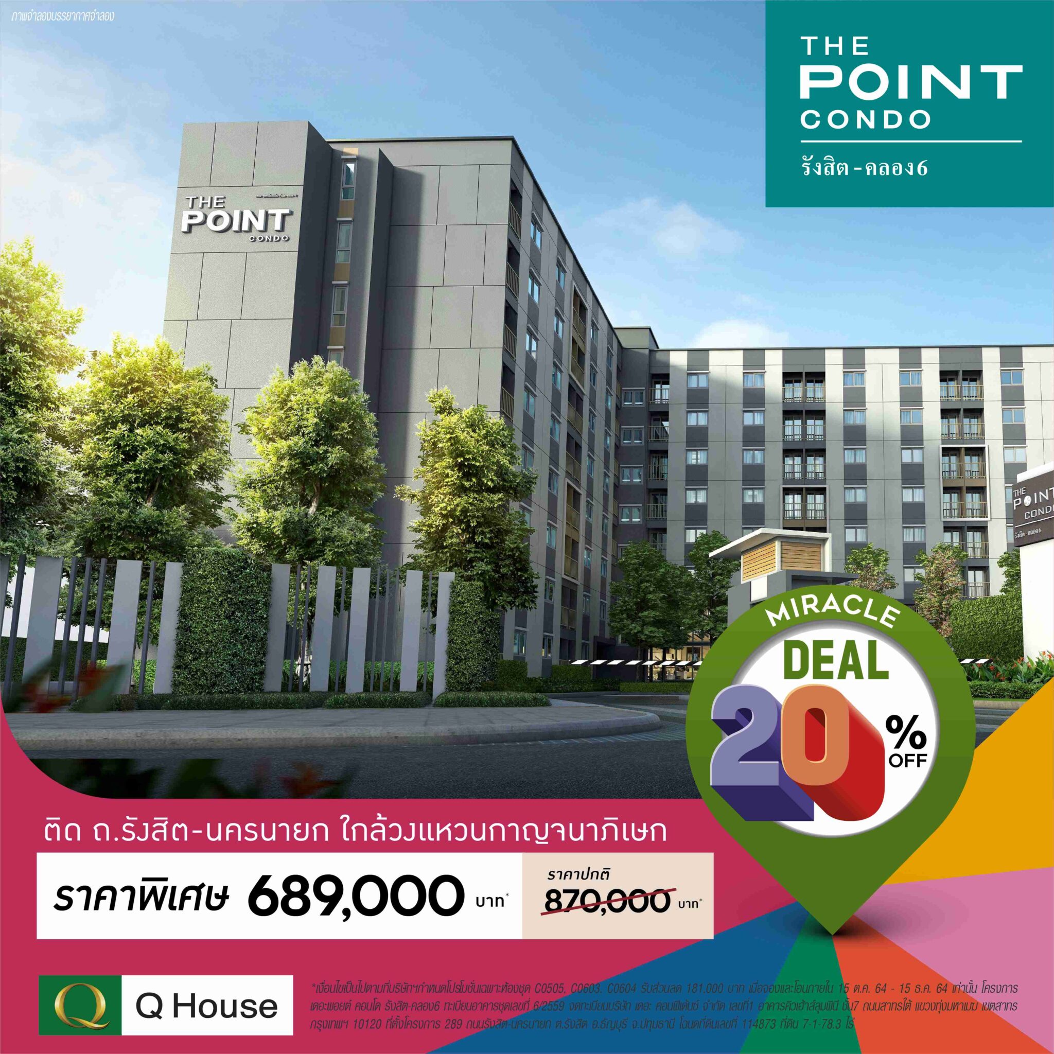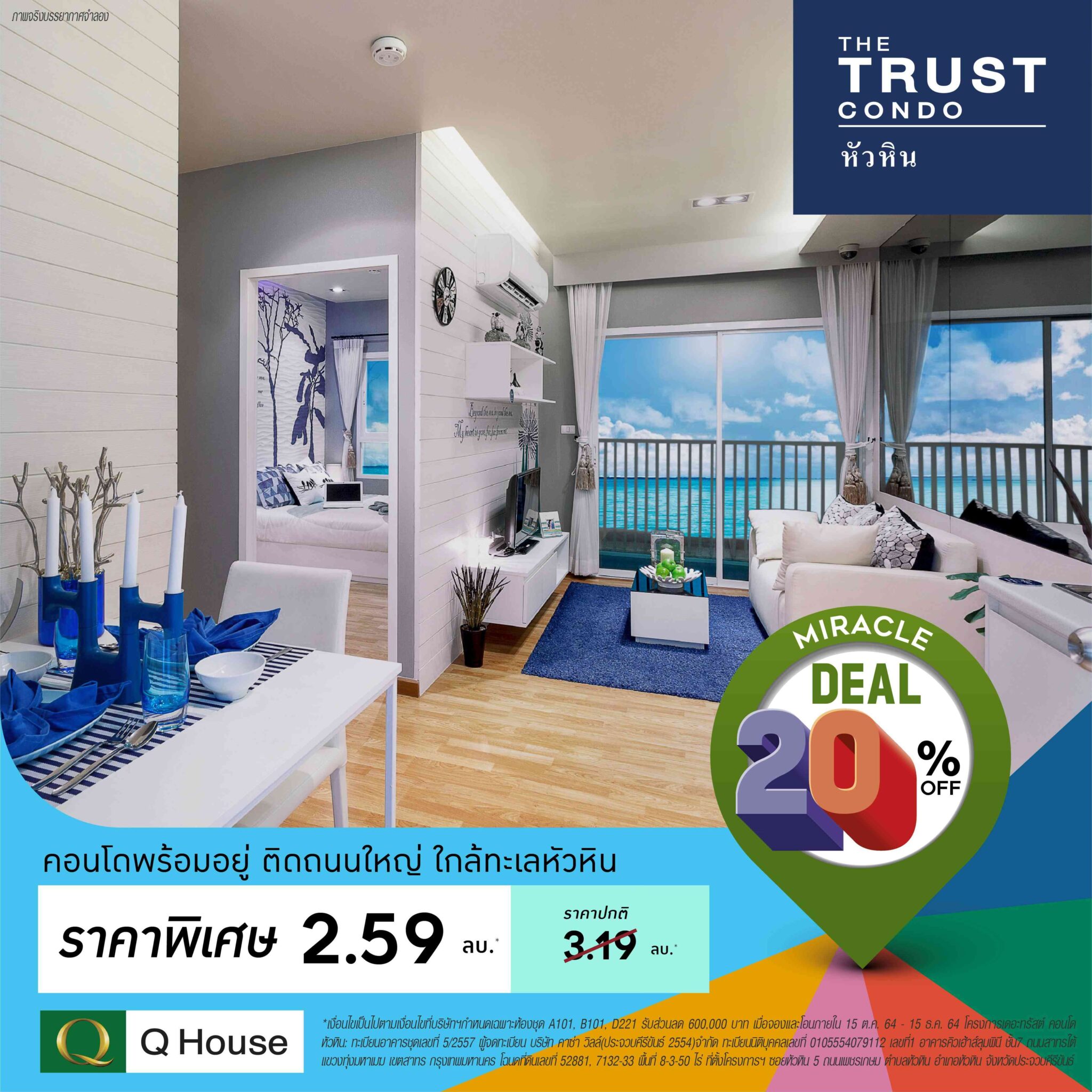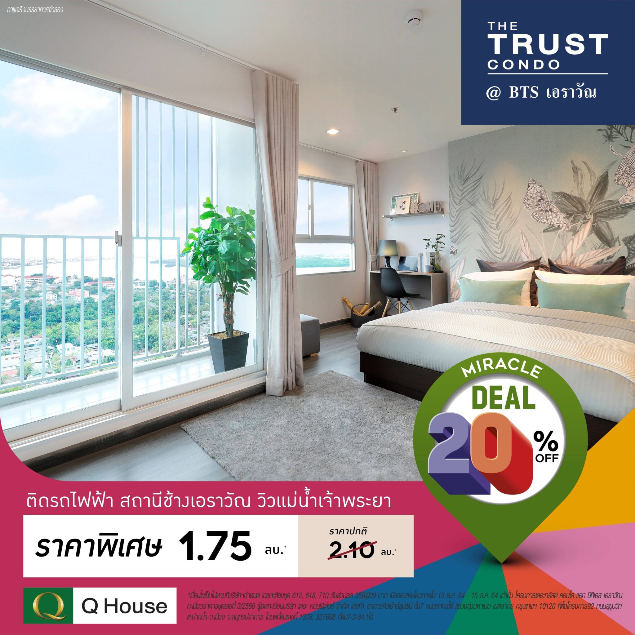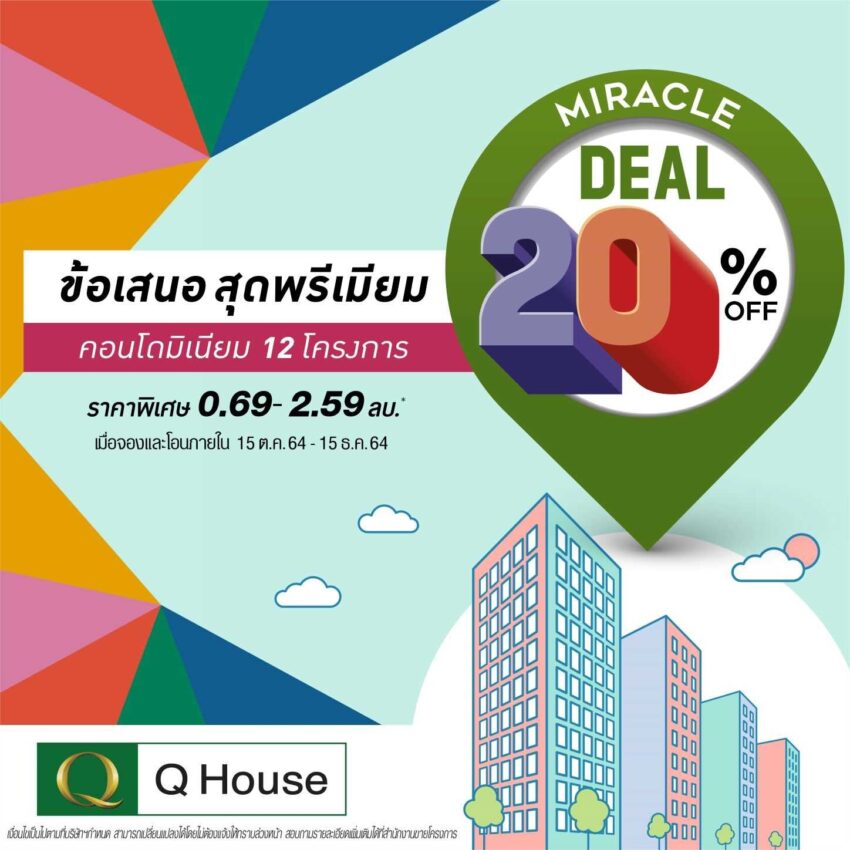 บริษัท ควอลิตี้เฮ้าส์ จำกัด (มหาชน) ผู้พัฒนาอสังหาริมทรัพย์ชั้นนำ ส่งแคมเปญกระตุ้นยอดขายโค้งสุดท้ายปลายปี ไตรมาส 4 ปี 2564 ภายใต้แคมเปญ “Miracle Deal 20%OFF ข้อเสนอสุดพรีเมียม” จัดเต็มส่วนลด 20% จากราคาปกติ กับ 12 โครงการคอนโดมิเนียม ของบริษัทฯและบริษัทในเครือ บนหลากหลายทำเลศักยภาพ สะดวกเชื่อมต่อเมือง ใกล้รถไฟฟ้า ใกล้ทางด่วน และช้อปปิ้งมอลล์ ในย่านบางใหญ่ งามวงศ์วาน BTS เอราวัณ รังสิต นครปฐม ชลบุรี ประจวบคีรีขันธ์ (หัวหิน) เชียงใหม่ เชียงราย พร้อมดีไซน์พื้นที่ สิ่งอำนวยความสะดวกส่วนกลางและภายในห้องพัก ตอบโจทย์ไลฟ์สไตล์คนรุ่นใหม่ สิทธิพิเศษเมื่อลูกค้าจองและโอนตั้งแต่วันนี้ – 15 ธันวาคม 2564 (*เงื่อนไขเป็นไปตามที่บริษัทฯกำหนด)