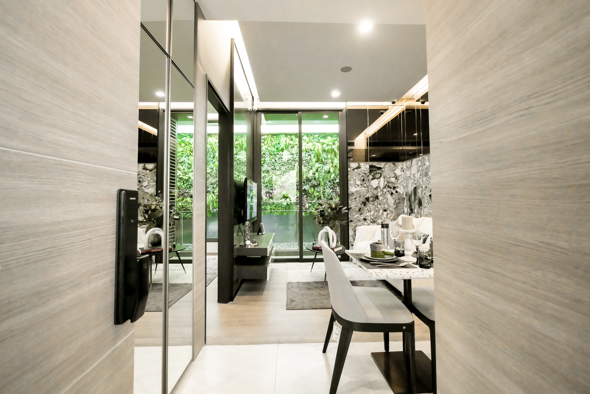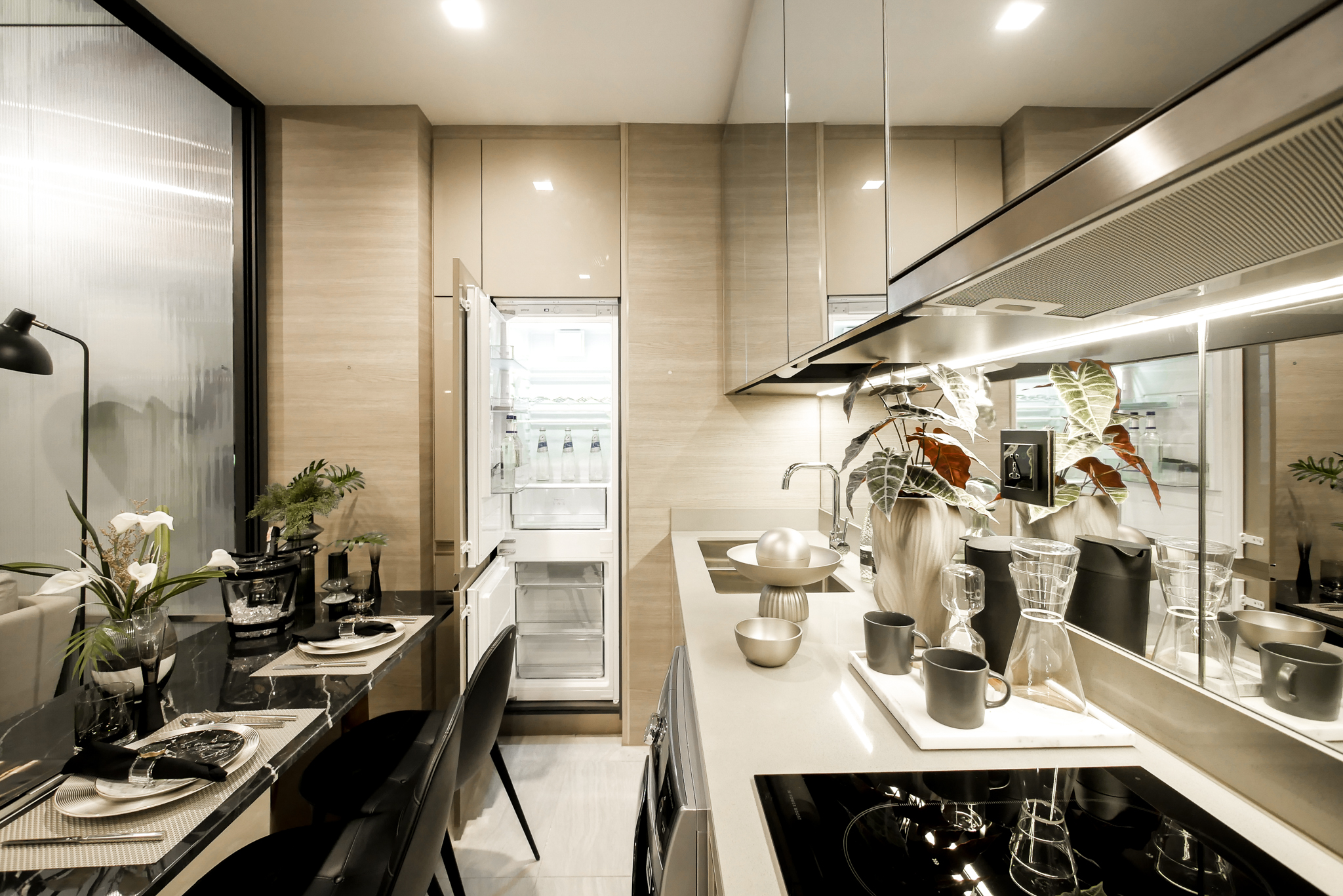 สำหรับ Type นี้มี 2 ห้องนอน 2 ห้องน้ำ ส่วนแรกที่เข้ามาจะเป็นส่วน Kitchen Area ที่สามารถปรับเปลี่ยนพื้นที่ได้ตามการใช้งาน เวลาทำอาหารสามารถเลื่อนประตูบานกระจกปิดส่วนครัวเพื่อไม่ให้กลิ่นรบกวนส่วนอื่นๆ ของบ้าน