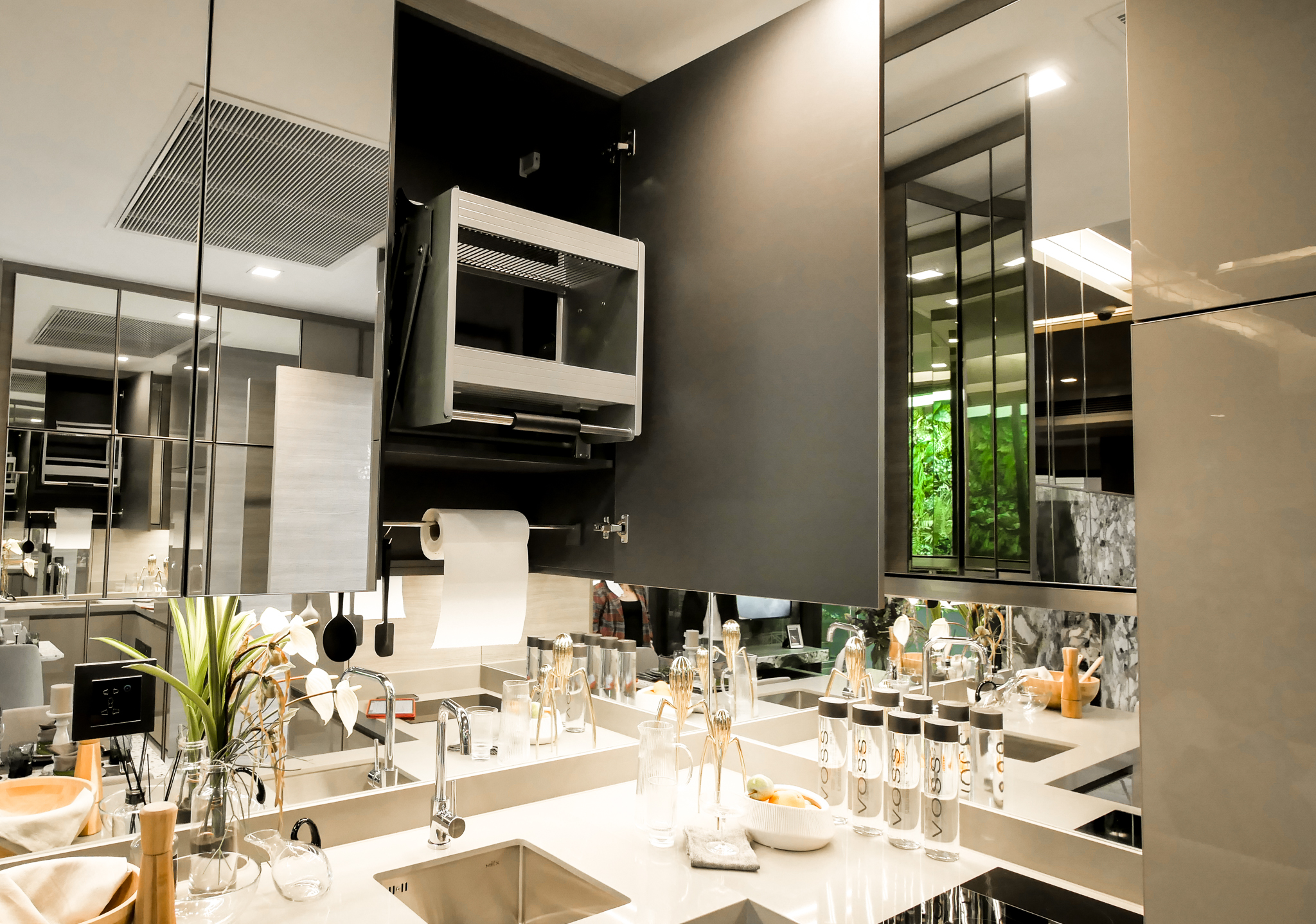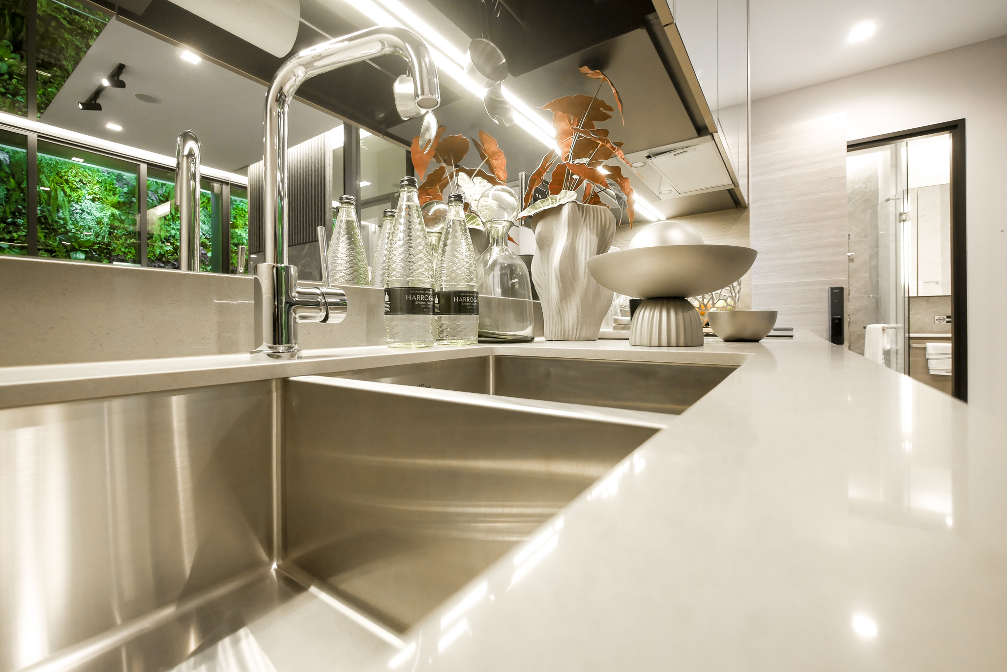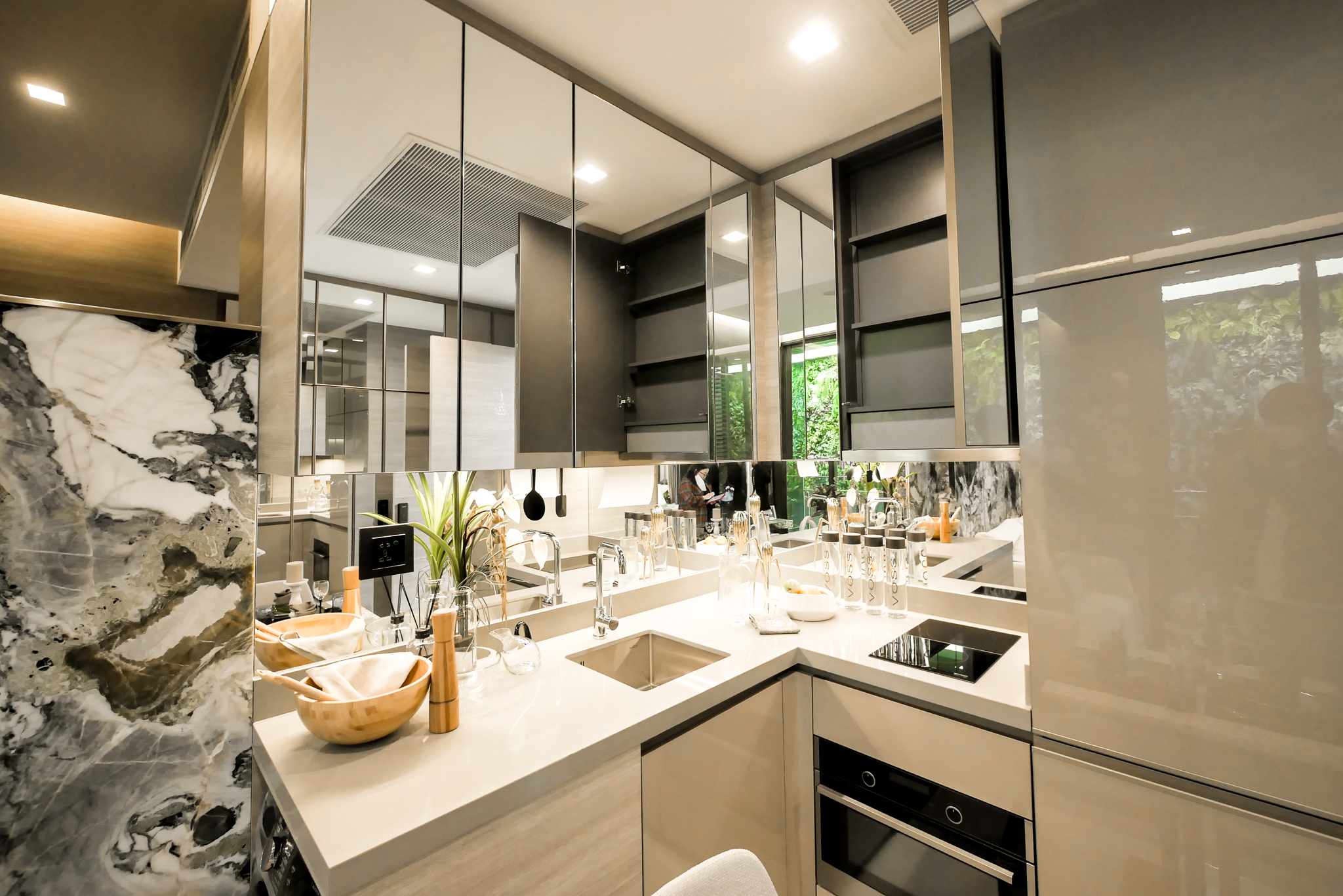 ส่วนของ Kitchen Area ทางโครงการให้ชุดครัวรูปตัวแอล ได้ฮอป ฮูป เป็นของ Gorenge เป็นเตา Induction 2 หัวเตา ตู้เหนือเตาทางโครงการทำเป็นตู้สำหรับเก็บเครื่องปรุง ทำให้เก็บของได้อย่างเป็นระเบียบ อ่างล้างจานขนาดใหญ่ และก๊อกน้ำของ MEX เหนืออ่างล้างจากโครงการทำเป็นที่เก็บจานที่สามารถดึงลงมาได้ พร้อมกับที่สำหรับใส่ทิชชู่