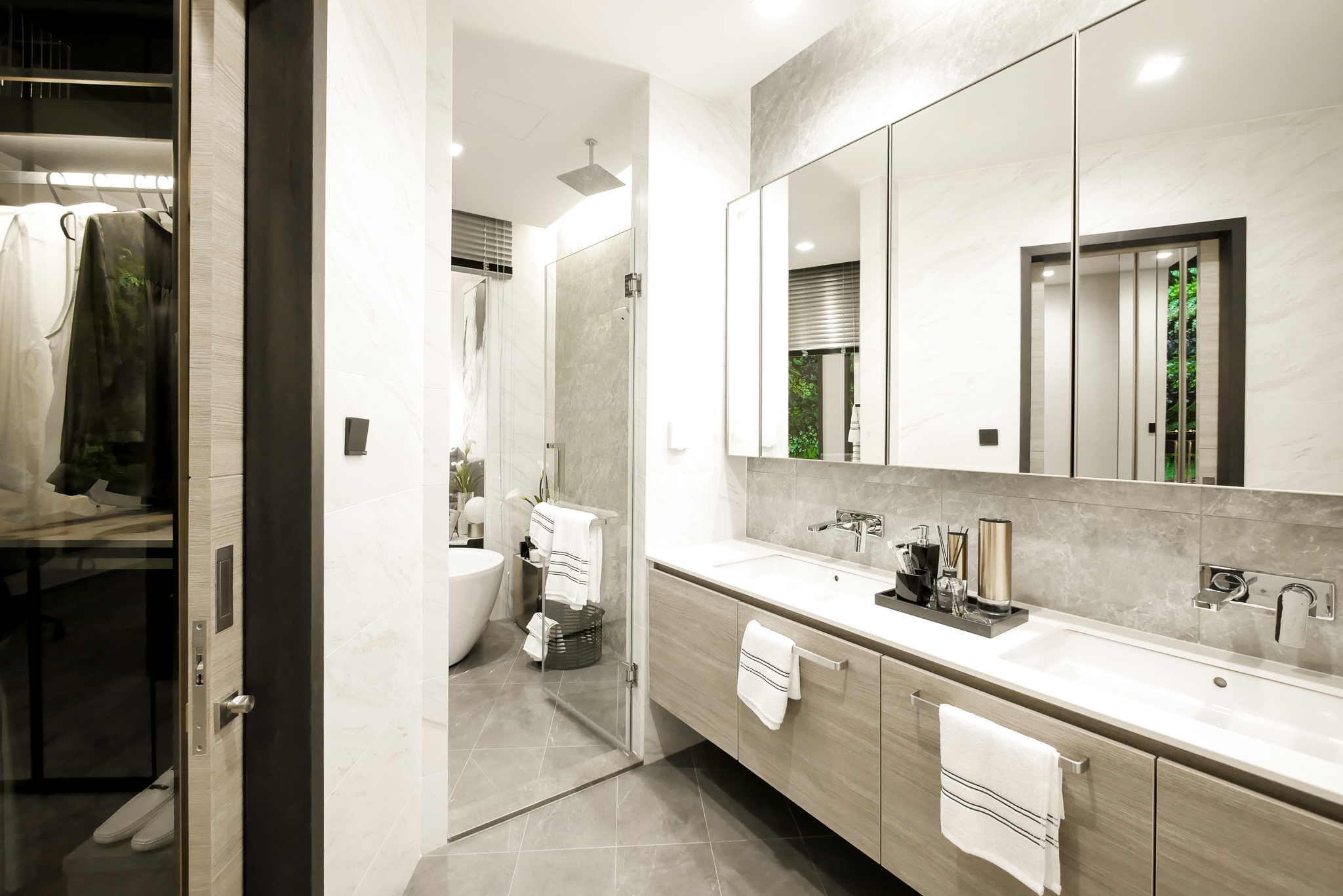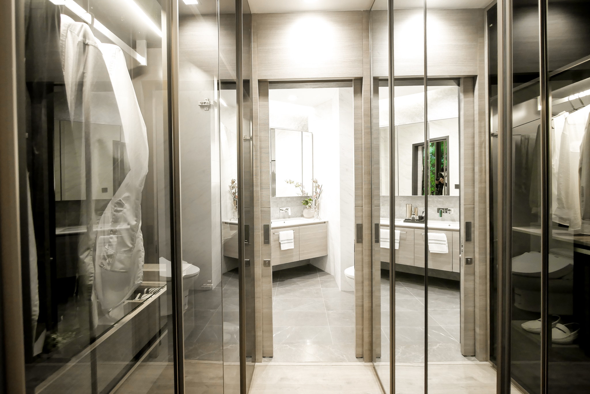 ห้องน้ำอยู่ภายในห้องนอนห้องน้ำใหญ่ แบ่งเป็นพื้นที่โซนเปียก และโซนแห้ง สุขภัณฑ์ภายในห้องน้ำเป็นของ TOTO ได้อ่างล้างหน้าขนาดใหญ่พร้อม Built in ตู้สำหรับเก็บของ มุมนี้น่าจะเป็นอีกมุมโปรดของสาวๆ เพราะกระจกตรงอ่างล้างหน้า โครงการติดไฟมาให้พร้อม สามารถยืนแต่งหน้าตรงนี้ได้เลย หรือจะม้วนผม ไดร์ฟผมก็สามารถทำได้เลย เพราะโครงการเตรียมปลั๊กไฟไว้ให้เรียบร้อย โถสุขภัณฑ์เป็นระบบอัตโนมัติของ TOTO ส่วนพื้นที่โซนเปียก ทางโครงการติดตั้ง Shower Box ความสูงจรดฝ้า พร้อมเจาะช่องสำหรับวางขวดแชมพู สบู่ไว้ให้ที่ผนัง ได้ฝักบัว และ Rain Shower ดีไซน์สวยงามทันสมัย