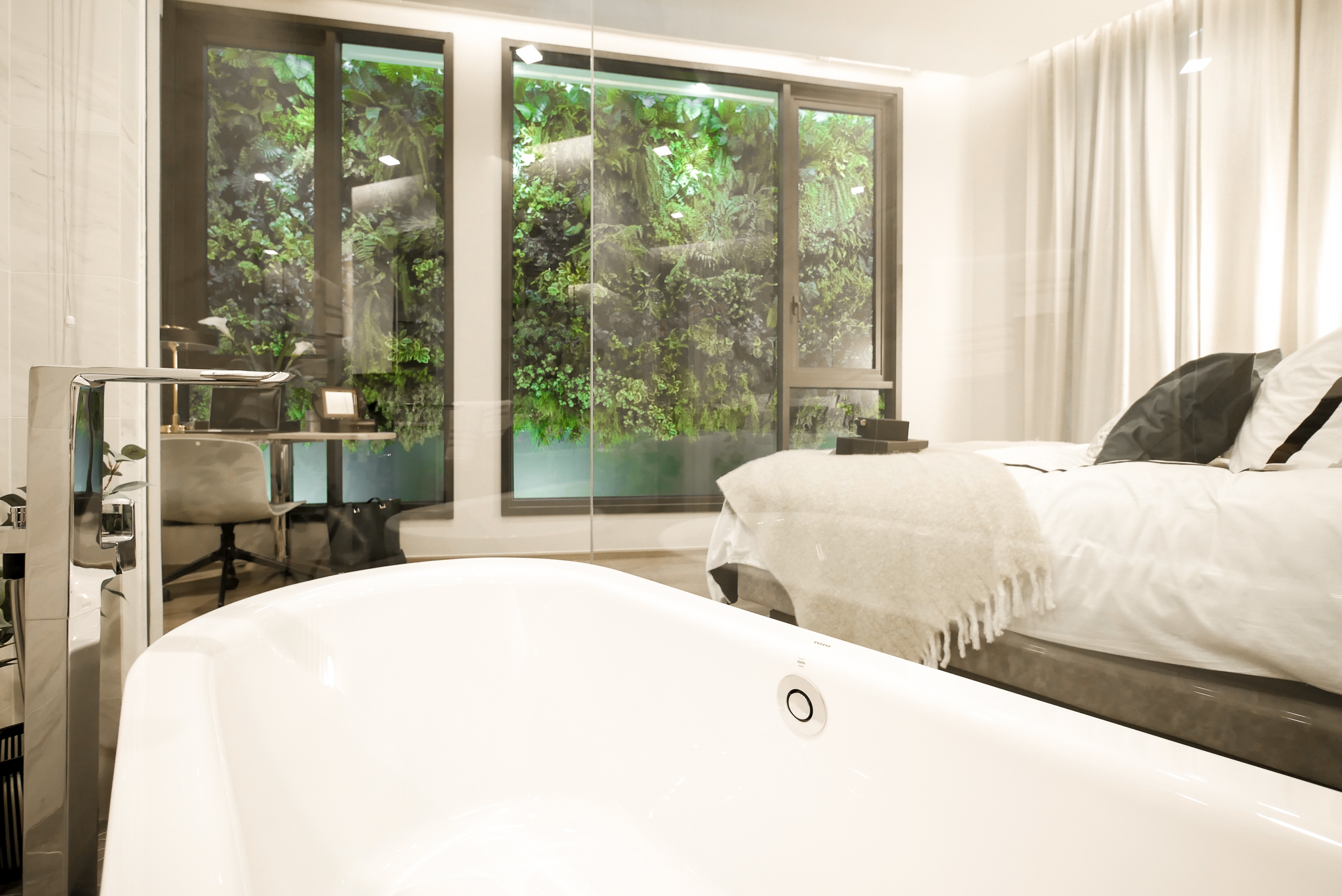 ส่วนของห้องนอนได้กระจกเข้ามุมแบบ Full Hight สามารถนอนชมวิวจากบนเตียงได้เลย ห้องนอนใหญ่สามารถวางเตียงขนาด 6 ฟุตได้สบายๆ และยังมีพื้นที่เหลือๆ ด้านข้างเตียงเตรียมปลั๊กไฟ พร้อมพอร์ต USB สำหรับชาร์ตมือถือเอาไว้ให้พร้อม พื้นที่ปลายเตียงสามารถติดทีวีได้