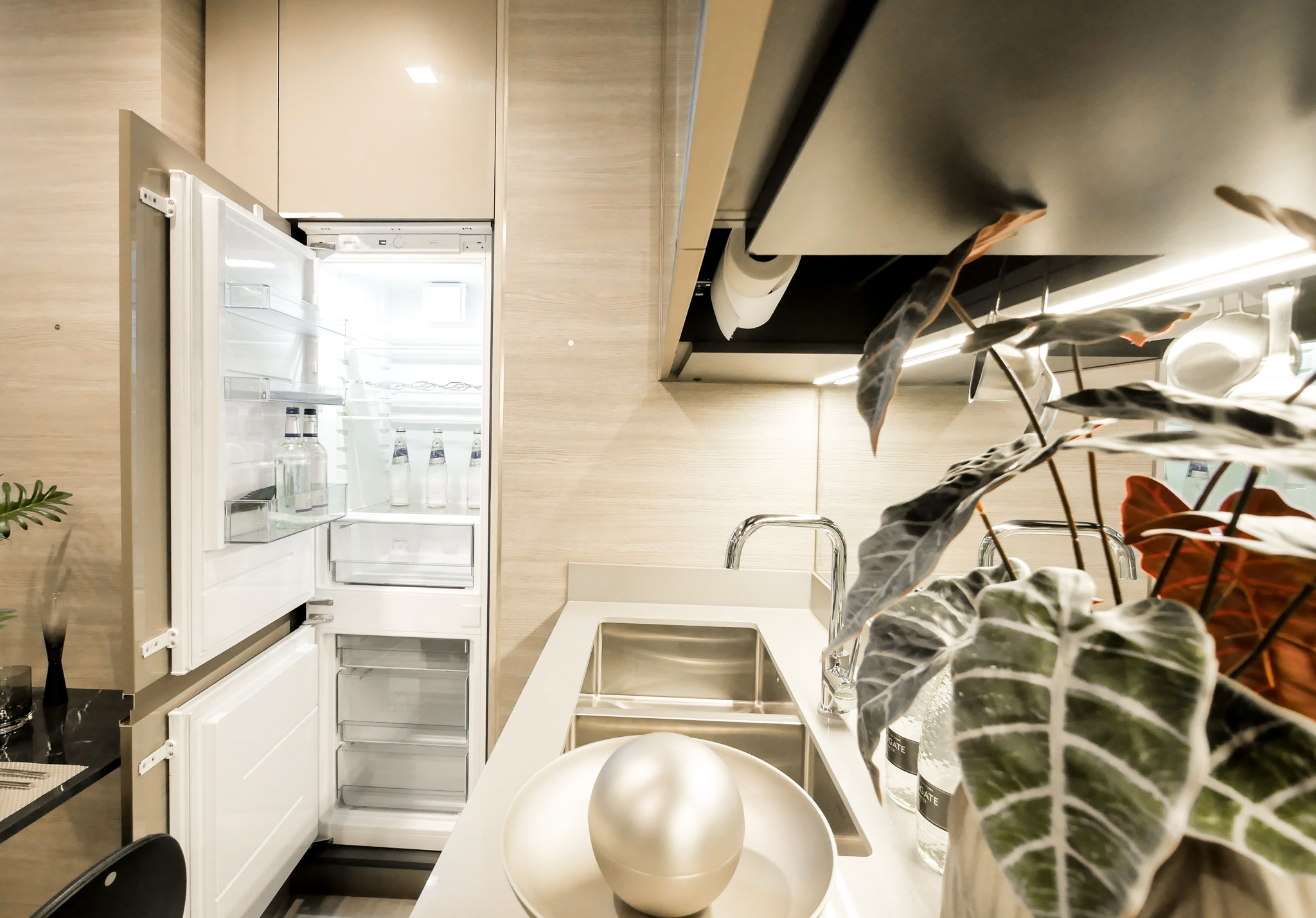 และด้านข้างเป็นตู้ Built in ขนาดพอดีกับตู้เย็น ซึ่งทางโครงการก็ให้ตู้เย็นด้วย เป็นของ Gorenge ในส่วนนี้เนียนไปกับห้อง ทำให้ดูเรียบหรู ไม่ขัดตา และตู้ด้านล่างยังเจาะช่องสำหรับวางไมโครเวฟ/เตาอบ ไว้ให้อีกด้วย จุดนี้ก็สะดวกหยิบจับง่าย