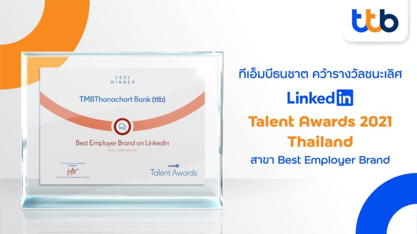 ธนาคารทหารไทยธนชาต จำกัด (มหาชน) หรือ TTB คว้ารางวัลชนะเลิศ LinkedIn Talent Awards 2021 Thailand สาขา Best Employer Brand สำหรับองค์กรที่มีพนักงานมากกว่า 1,000 คนขึ้นไป จากการจัดอันดับโดยบริษัท LinkedIn แฟลตฟอร์มเครือข่ายสังคมสำหรับอาชีพและโลกธุรกิจที่ใหญ่ที่สุดในโลก ท่ามกลางผู้ประกอบการในไทยกว่า 12,600 บริษัทที่ใช้งาน LinkedIn นับเป็นรางวัลที่ตอกย้ำความมุ่งมั่นของธนาคารในการบริหารทรัพยากรบุคคล รวมถึงการสนับสนุนสภาพแวดล้อมการทำงานโดยรวมของพนักงาน ตอกย้ำแนวทางการปลดล็อกศักยภาพพนักงานให้เป็นคนที่เก่งขึ้นในทุกวัน (Be Your Best)