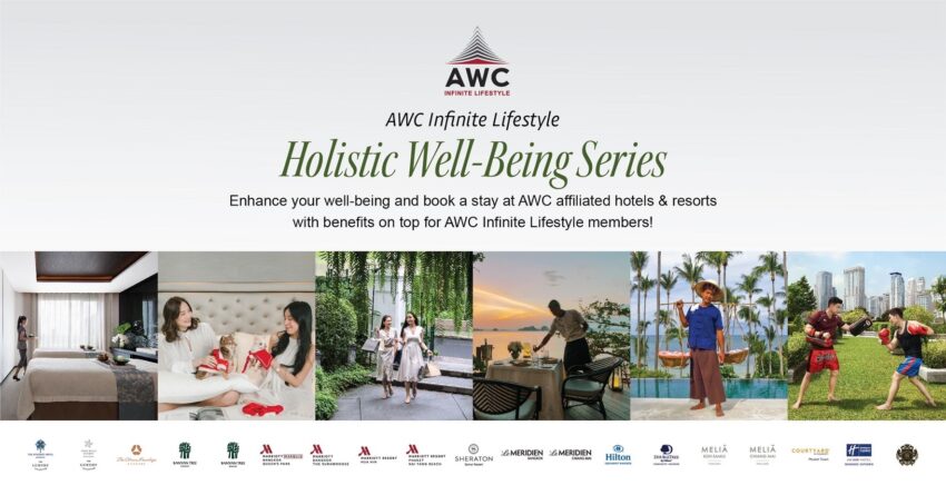 เต็มอิ่มไปกับสิทธิประโยชน์มากมายสำหรับผู้ที่ใส่ใจในเรื่องการดูแลตัวเอง สู่การมีคุณคุณภาพชีวิตที่ดี (Well-Being) จากทั้งภายในสู่ภายนอก ผ่านประสบการณ์สุดพิเศษจากทางโรงแรมและรีสอร์ทชั้นนำในเครือ AWC ใน 6 เมืองท่องเที่ยวสำคัญทั่วประเทศ กับแคมเปญ “AWC Infinite Lifestyle Holistic Well-Being Series” ด้วยการดีไซน์รูปแบบแพ็กเกจเพื่อตอบโจทย์คนรักการดูแลสุขภาพ ทั้งด้านร่างกายและจิตใจ ด้านสังคม ด้านอาหารการกิน และด้านอารมณ์ ไม่ว่าจะเป็นสิทธิประโยชน์ในเรื่องของห้องพัก เมนูอาหารเพื่อสุขภาพ บริการสปาและทรีตเมนต์เพื่อสุขภาพและการผ่อนคลาย รวมถึงกิจกรรมอื่นๆ อีกมากมายที่จะช่วยเพิ่มสีสันในช่วงวันหยุดพักผ่อนให้เต็มไปด้วยความสุข พร้อมคุ้มค่ามากยิ่งขึ้นกับสิทธิประโยชน์ออนท็อปในสัปดาห์พิเศษเมื่อซื้อโปรโมชั่นหรือแพ็กเกจ AWC Infinite Lifestyle Holistic Well-Being Series ที่จะผลัดเปลี่ยนหมุนเวียนกันไปในแต่ละโรงแรมไม่ซ้ำกันตลอดระยะเวลาของแคมเปญ เริ่มต้นตั้งแต่สัปดาห์นี้เป็นต้นไป เพียงแสดงสถานะสมาชิก “AWC Infinite Lifestyle” (ทุกระดับสมาชิก) กับเจ้าหน้าที่ก่อนเข้ารับบริการ