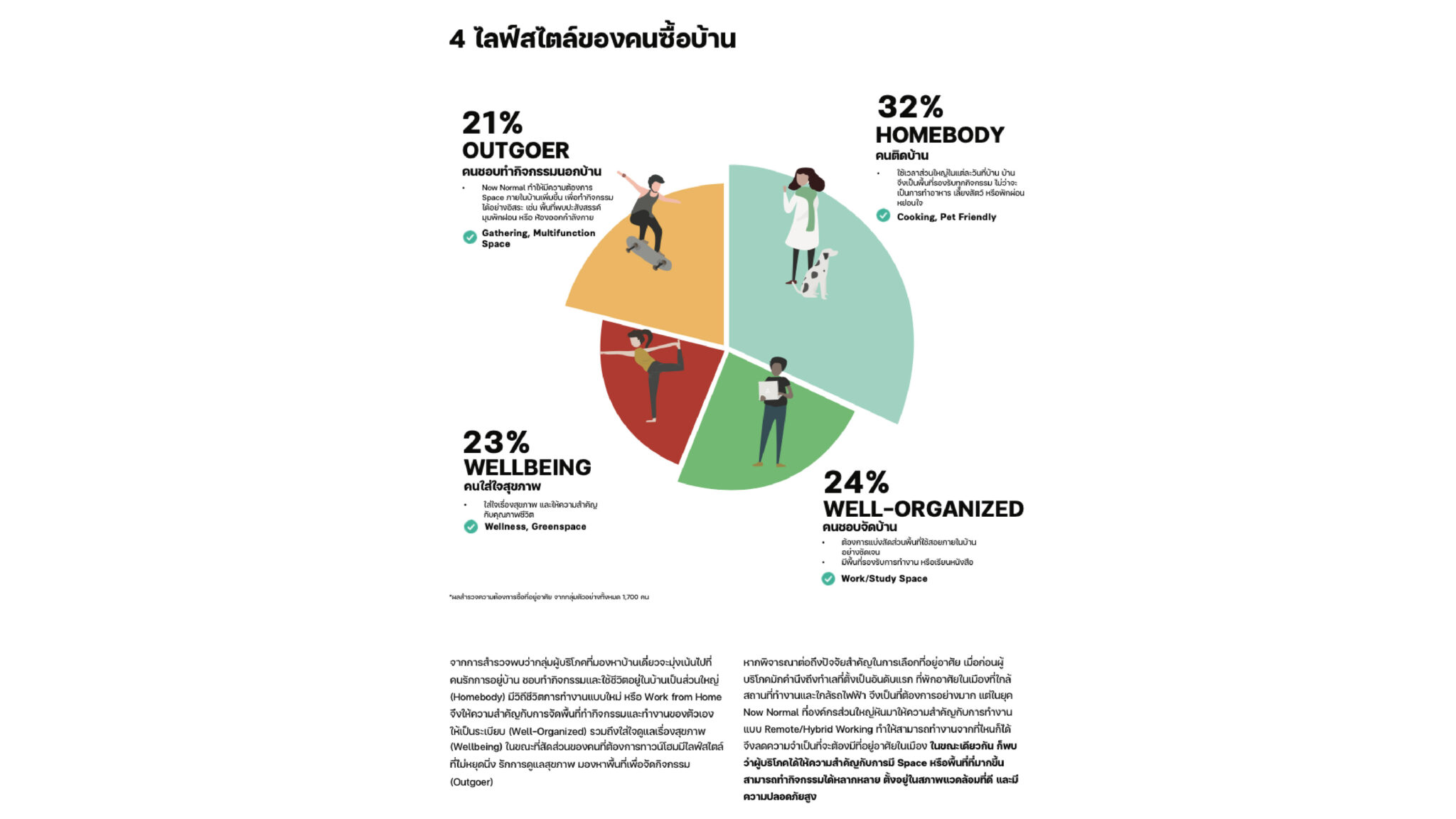 จากรายงานพบว่าที่ผ่านมาสถานการณ์โควิด-19 ได้ส่งผลกระทบในวงกว้างทั้งในด้านเศรษฐกิจและสังคม ตลอดจนยังสร้างการเปลี่ยนแปลงในระดับพฤติกรรมของผู้คนในสังคม ที่ให้ความสำคัญอย่างมากกับสุขภาพและความปลอดภัย การทำกิจกรรมภายในบ้าน ไม่ว่าจะเป็นการทำงาน การใช้ชีวิตประจำวัน รวมถึงการออกกำลังกาย จึงกลายเป็นวิถีชีวิตใหม่ของคนในวันนี้ ทำให้ที่อยู่อาศัยที่สามารถตอบสนองรูปแบบการใช้ชีวิตยุค Now Normal เป็นที่ต้องการมากยิ่งขึ้น โดย REDPAPER ได้ทำการสำรวจและวิเคราะห์ข้อมูลของกลุ่มตัวอย่างจำนวน 1,700 คน อายุระหว่าง 22-53 ปี ที่มีรายได้ต่อเดือน 35,000-160,000 บาท ในช่วงปลายปี 2564 พบว่าสามารถแบ่งประเภทผู้บริโภคที่สนใจซื้อที่อยู่อาศัยตามไลฟ์สไตล์ได้เป็น 4 กลุ่ม ได้แก่