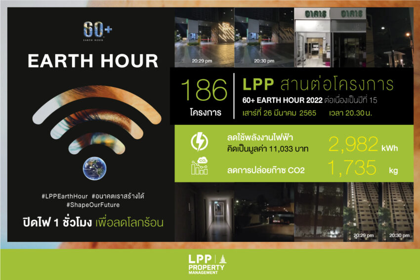 บริษัท แอล พี พี พรอพเพอร์ตี้ มาเนจเมนท์ จำกัด (LPP) สานต่อกิจกรรม 60+ EARTH HOUR 2022 เชิญชวนผู้พักอาศัยในโครงการที่ LPP บริหารร่วมจำนวน 186 โครงการ “ปิดไฟ 1 ชั่วโมง เพื่อลดโลกร้อน” ตั้งแต่เวลา 20.30 – 21.30 น. ซึ่งจะ สามารถลดพลังงานไฟฟ้ารวมกันได้ถึง 2,982 กิโลวัตต์-ชั่วโมง (kWh) หรือคิดเป็นมูลค่า 11,033 บาท และยังช่วยลดการปล่อยก๊าซ CO2 ได้ถึง 1,735kg