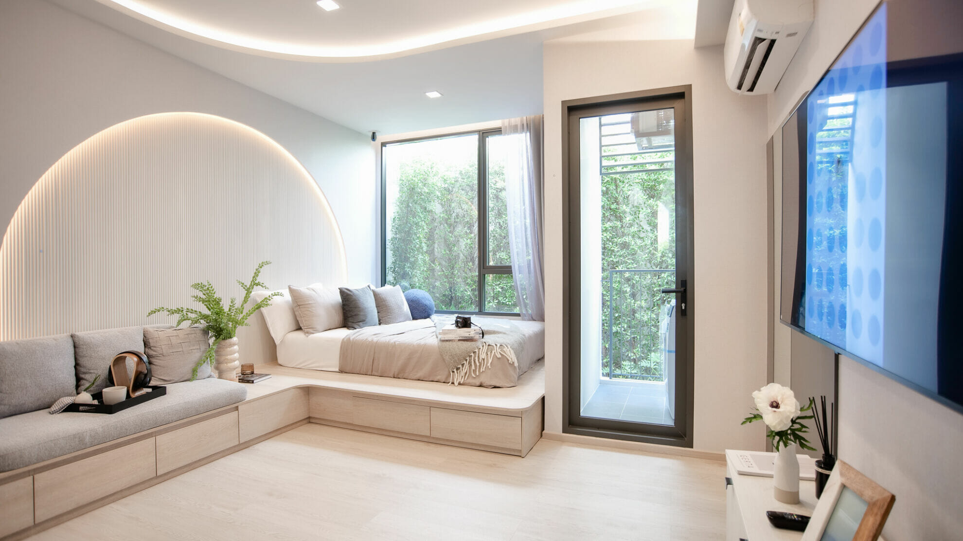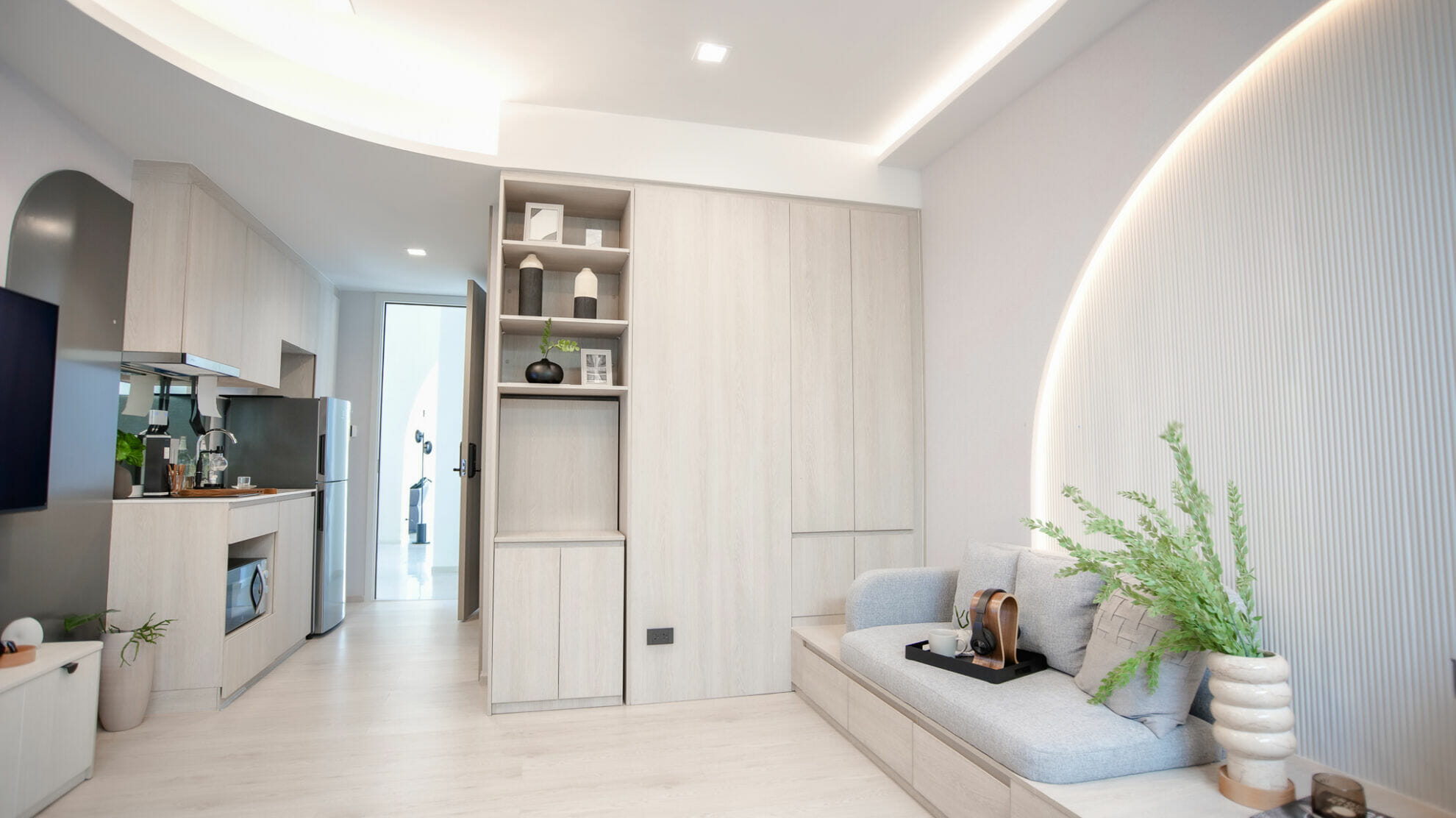 สำหรับห้องตัวอย่างภายใน Sales Gallery มีทั้งหมด 3 ห้อง 1. Studio 2. 1 Bedroom 3. 2 Bedroom เป็นห้องชุดแบบ Fully Furnished มีเฟอร์นิเจอร์ที่ออกแบบพร้อมปรับเปลี่ยนฟังก์ชันการใช้งานได้ตามความต้องการ ราคาเริ่มต้น 3.29 ล้านบาท