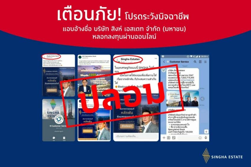 สิงห์ เอสเตทฯแจ้งมีมิจฉาชีพ แอบอ้างชื่อ โลโก้ รูปผู้บริหารบริษัทฯแอบอ้างผ่านสื่อและโซเชียล แนะประชาชนอย่างหลงเชื่อ ระบุข้อมูลข่าวสารจะแจ้งผ่านเว็บไซต์– Social Media ของบริษัทเท่านั้น