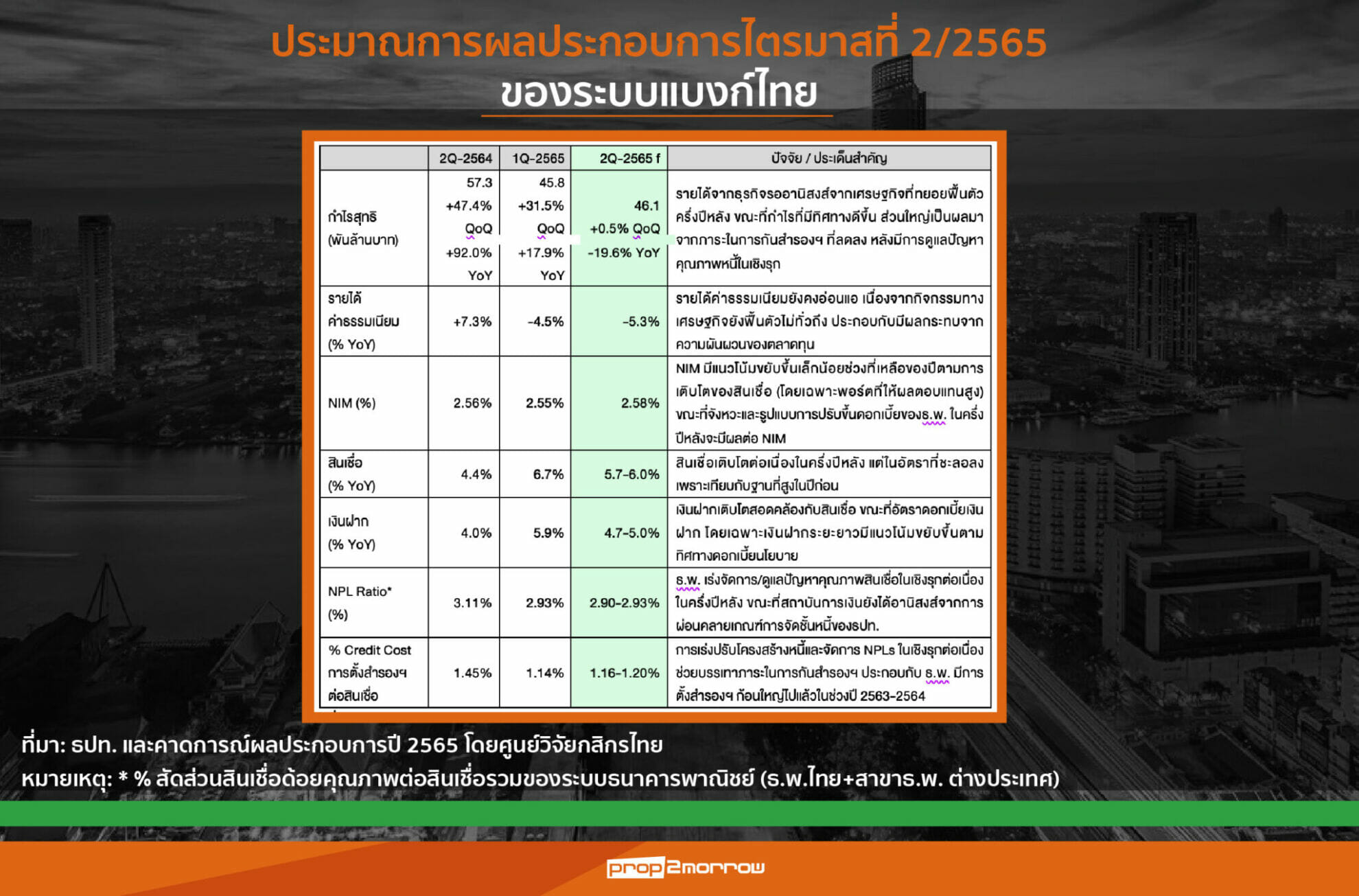 ดังนั้นศูนย์วิจัยกสิกรไทย คาดว่ากำไรสุทธิของระบบธนาคารพาณิชย์ไทยในไตรมาส 2 นี้ประมาณ 4.61 หมื่นล้านบาท ลดลง 19.6% เมื่อเทียบกับฐานที่สูงในไตรมาส 2 ปี 2564 ซึ่งมีการบันทึกรายการพิเศษกำไรจากเงินลงทุนจากการขายหุ้นในบริษัทย่อยของธนาคารพาณิชย์แห่งหนึ่ง