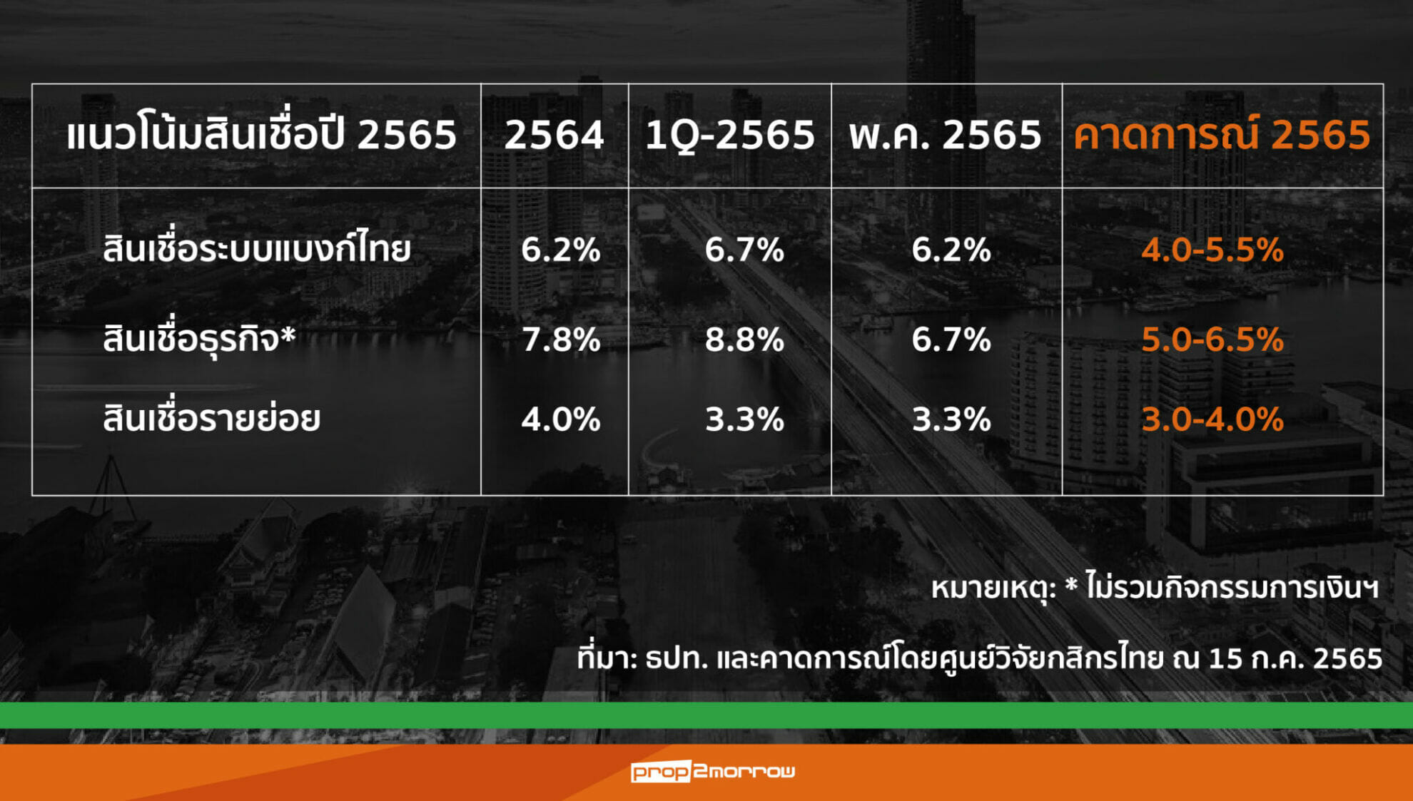 อย่างไรก็ตามการคลายล็อกมาตรการโควิด-19 จะช่วยหนุนสัญญาณเศรษฐกิจและสินเชื่อ ทำให้ศูนย์วิจัยกสิกรไทยคาดการณ์ว่าสินเชื่อของระบบธนาคารพาณิชย์ไทยในปี 2565 จะอยู่ที่ 5.0% เพิ่มขึ้นจากคาดกาณณ์เดิมเมื่อเดือนมีนาคมที่ตั้งไว้ที่ 4.5% เนื่องจากการเบิกใช้สินเชื่อเติบโตต่อเนื่องของภาคธุรกิจในช่วงที่ผ่านมาและมีแนวโน้มความต้องการสินเชื่อต่อเนื่องในช่วงครึ่งหลังของปีนี้ โดยเฉพาะสินเชื่อธุรกิจที่เติบโตต่อเนื่อง เพราะได้รับอานิสงส์จากสัญญาณกิจกรรมทางเศรษฐกิจในภาพรวม และยังมีแรงหนุนในส่วนของสินเชื่อเพื่อเป็นเงินทุนหมุนเวียนหรือ Working Capital ที่เพิ่มขึ้นตามราคาวัตถุดิบและต้นทุนอื่นๆ ในการผลิตสินค้าและบริการ