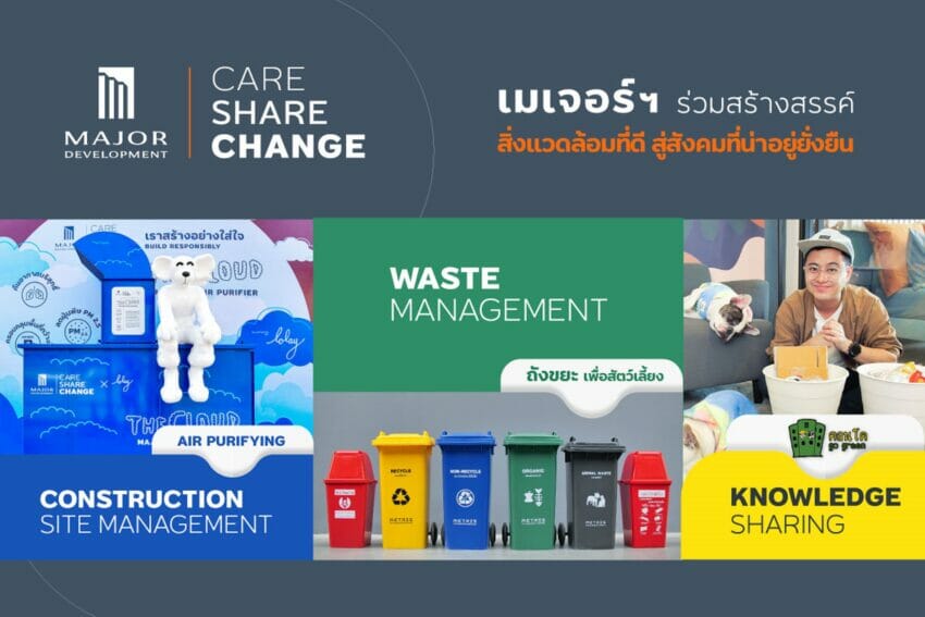 เมเจอร์ ดีเวลลอปเม้นท์ ต่อยอดแคมเปญ CARE-SHARE-CHANGE เดินหน้า 3 แกนกิจกรรมต่อเนื่อง ทั้งการบำบัดอากาศ-การจัดการขยะ-การแบ่งปันองค์ความรู้ด้านสิ่งแวดล้อม ลุยลงพื้นที่หลากโครงการ ดำเนินหลากหลายกิจกรรม เช่น ติดตั้งเครื่องบำบัดอากาศขนาดยักษ์ที่ไซต์ก่อสร้าง ส่งเสริมให้ลูกบ้าน-พนักงาน จัดการแยกขยะอย่างจริงจัง ร่วมกับอินฟลูเอนเซอร์ด้านสิ่งแวดล้อม “Konggreengreen” ให้ความรู้ด้านการจัดการขยะอย่างถูกวิธี เพื่อร่วมสร้างสรรค์สิ่งแวดล้อมที่ดี เกิด Green Living, Green Office, Green Site สร้างสังคมบ้านและคอนโดฯให้น่าอยู่อย่างยั่งยืน