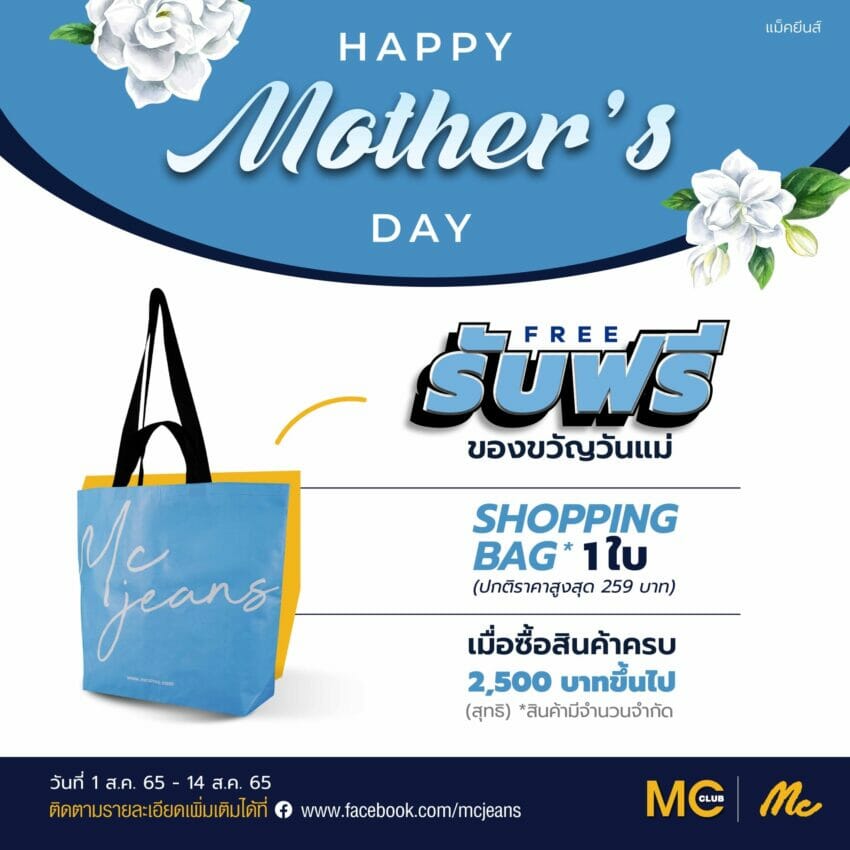 แม็คยีนส์แบรนด์ยีนส์อันดับ 1 ของเมืองไทย ชวนช้อปวันแม่กับโปรสุดพิเศษ เมื่อซื้อสินค้า2,500 บาทขึ้นไป รับฟรี กระเป๋า Shopping Bag คอลเลคชั่นวันแม่ สินค้ามีจำนวนจำกัด พิเศษสำหรับสมาชิก Mc Club เมื่อซื้อสินค้าแม็คยีนส์ รับทันทีคะแนนคูณสอง Mc Club x 2 ตั้งแต่วันนี้ -14 สิงหาคม 2565