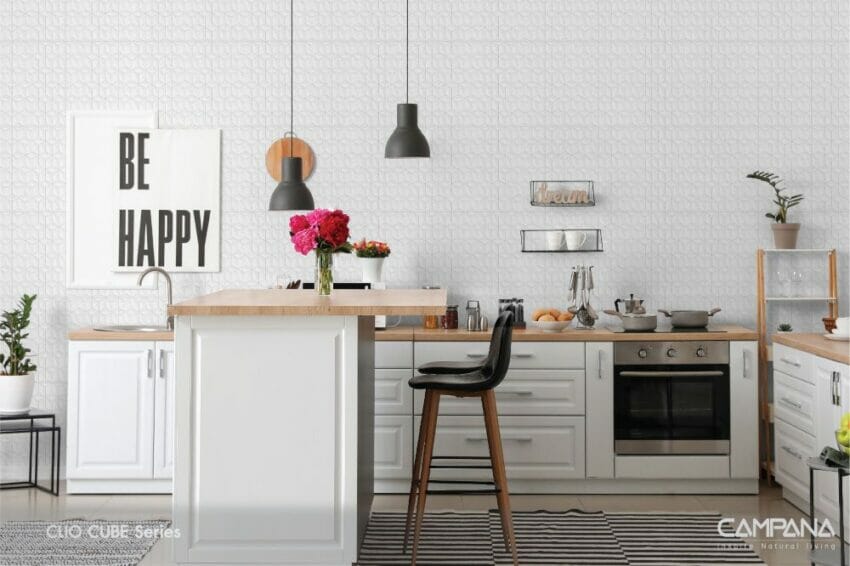 คนเกาหลีที่อยู่ในเมืองใหญ่ โดยส่วนใหญ่มักจะอยู่อพาร์ตเมนต์  ห้องที่มีเนื้อที่น้อยจึงต้องบริหารจัดการให้ใช้พื้นที่ได้อย่างคุ้มค่า  แนะนำวางแปลนให้มีพื้นที่ทำอาหารและล้างจานเป็นรูปตัวแอล (L) ดีไซน์ให้มีโต๊ะอเนกประสงค์สำหรับวางอาหารที่ปรุงเสร็จและเป็นโต๊ะทานอาหารไปในตัว โทนสีที่นิยมใช้มักจะเป็นสีขาว ทำให้ดูโปร่งโล่ง สะอาดตา  เพิ่มการตกแต่งให้มีดีไซน์เพียงกรุผนังห้องด้วยกระเบื้องคัมพานาลายคลีโอคิวบ์ซีรี่ย์ ออกแบบลวดลายเป็นลายเส้นกราฟิก เพิ่มมิติของพื้นผิวด้วยการทำให้มีร่องลึกทรงลูกบาศก์ เคลือบพื้นผิวให้มีความมันวาว ทำให้ผนังดูโดดเด่นมากขึ้น  อีกทั้งยังช่วยทำให้เช็ดทำความสะอาดจากคราบมันหรือคราบสกปรกที่เกิดจากการทำอาหารได้ง่าย  ตกแต่งเพิ่มเติมด้วยผ้าปูพื้นลายขาวสลับดำ ให้อารมณ์เหมือนอยู่ในเมืองหนาว