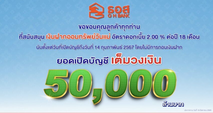 ธอส.เผย“เงินฝากออมทรัพย์วันแม่”ยอดฝากเต็มวงเงิน 5 หมื่นล้านบาทแล้ว