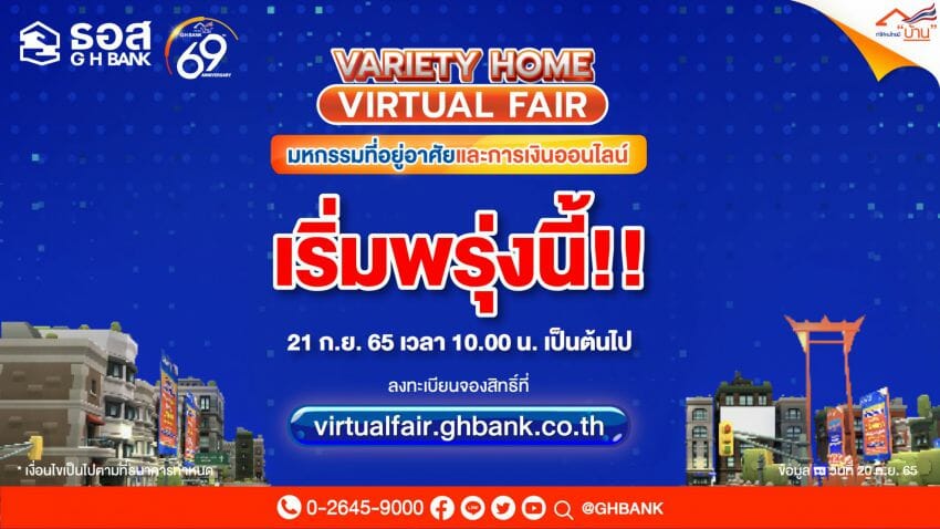 ธนาคารอาคารสงเคราะห์ (ธอส.) ฉลองครบรอบการดำเนินงาน 69 ปี จัดงาน Variety Home Virtual Fair : มหกรรมที่อยู่อาศัยและการเงินออนไลน์จาก ธอส. ครั้งที่ 2 เริ่มเปิดให้ลูกค้าประชาชนลงทะเบียนเข้าร่วมงานทางเว็บไซต์ virtualfair.ghbank.co.th ตั้งแต่วันพุธที่ 21 กันยายน 2565 เวลา 10.00 น. เป็นต้นไป พบกับโปรโมชั่นพิเศษที่มีเฉพาะในงานนี้ที่เดียวเท่านั้น สินเชื่อบ้านอัตราดอกเบี้ยพิเศษ ต่อที่ 1 ปีที่ 1 เท่ากับ MRR-4.46% (ปัจจุบันเท่ากับ 1.69%) ต่อปี อัตราดอกเบี้ยเฉลี่ย 3 ปีแรกเพียง 2.35% ให้กู้สำหรับซื้อที่อยู่อาศัยในราคาซื้อ-ขายไม่เกิน 3 ล้านบาท และยังมีสินเชื่ออัตราดอกเบี้ยต่ำแบบสุด ๆ ในช่วง Golden Minute เงินฝากออมทรัพย์อัตราดอกเบี้ยสูง 2.00% ต่อปี พร้อมช่วง Golden Minute รับอัตราดอกเบี้ยพิเศษเฉพาะในงานนี้ บ้านมือสอง ธอส. ราคาไม่เกิน 3 ล้านบาท มากกว่า 4,000 รายการทั่วประเทศ ให้ส่วนลดสูงสุดถึง 50% และบ้านมือหนึ่ง ราคาขายไม่เกิน 3 ล้านบาท จากผู้ประกอบการอสังหาริมทรัพย์ทั่วประเทศกว่า 100 โครงการ พร้อมด้วยส่วนลดและของแถมมากมาย ทั้งนี้ สินเชื่อและเงินฝากในงานมีจำนวนจำกัด จองก่อนได้ก่อนหมดแล้วหมดเลย โดยงาน Variety Home Virtual Fair : มหกรรมที่อยู่อาศัยและการเงินออนไลน์จาก ธอส. ครั้งที่ 2 จะจัดขึ้นระหว่างวันที่ 21-25 กันยายน 2565
