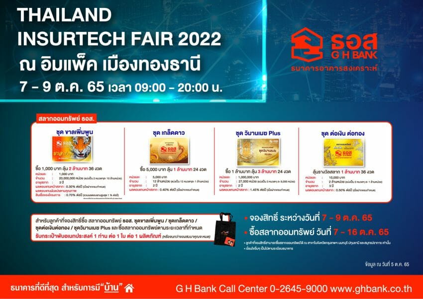 ธนาคารอาคารสงเคราะห์ (ธอส.) ขนโปรโมชั่นร่วมงาน “Thailand Insurtech Fair 2022” เพื่อเพิ่มโอกาสให้คนไทยได้เข้าถึงผลิตภัณฑ์ทางการเงินของธนาคาร นำโดย สินเชื่อบ้านอัตราดอกเบี้ยต่ำปีที่ 1 เท่ากับ MRR-3.55% (ปัจจุบันเท่ากับ 2.60%) ต่อปี เฉลี่ย 3 ปีแรกเพียง 2.917% (อัตราดอกเบี้ย MRR ของ ธอส.ในปัจจุบันเท่ากับ 6.150% ต่อปี) ผ่อนชำระนานสูงสุดถึง 40 ปี ให้กู้ครอบคลุมทุกวัตถุประสงค์หลัก อาทิ ซื้อบ้าน/คอนโดมิเนียม ปลูกสร้าง และรีไฟแนนซ์ หลักประกันในการยื่นคำขอกู้ต้องอยู่ในพื้นที่จังหวัด กรุงเทพฯ นนทบุรี ปทุมธานี และสมุทรปราการ เท่านั้น จองสิทธิ์ภายในงาน ยื่นกู้ตั้งแต่วันที่ 7 ตุลาคม -15 พฤศจิกายน 2565 อนุมัติและทำนิติกรรมภายในวันที่ 30 ธันวาคม 2565 พิเศษ สำหรับลูกค้าสินเชื่อที่มีวงเงินทำนิติกรรมสูงสุด 4 อันดับแรก รับเครื่องทำน้ำแข็งอัตโนมัติฟรี และ สลากออมทรัพย์ ธอส. ให้ผลตอบแทนดีโอกาสถูกรางวัลสูง ประกอบด้วย