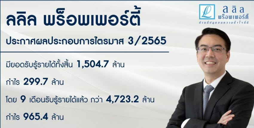 นายชูรัชฏ์ ชาครกุล กรรมการผู้จัดการ บริษัท ลลิล พร็อพเพอร์ตี้ จำกัด (มหาชน) กล่าวว่า ผลการดำเนินงานไตรมาส 3 ที่ผ่านมาบริษัทมียอดรับรู้รายได้ 1,504.7 ล้านบาท ปรับลดลง 7.4% เนื่องจากงานก่อสร้างล่าช้าเพราะปีนี้มีฝนตกมากกว่าปกติ