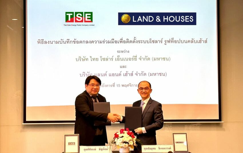 นายชัยยุทธ ชินมหาวงศ์ (ขวา) ผู้ช่วยกรรมการผู้จัดการ บริษัท แลนด์ แอนด์ เฮ้าส์ จำกัด (มหาชน) หรือ LH ลงนามในบันทึกความเข้าใจ (MOU) ร่วมกับ นายกิติพงษ์ ธัญน้อม (ซ้าย) ประธานเจ้าหน้าที่ฝ่ายวิศวกรรม บริษัท ไทย โซล่าร์ เอ็นเนอร์ยี่ จำกัด (มหาชน) TSE เพื่อติดตั้งระบบโซลาร์ รูฟท็อปบนหลังคาคลับเฮาส์ ในโครงการบ้านของแลนด์ แอนด์ เฮ้าส์ ทั้งหมด 5 โครงการ เพื่อส่งมอบพลังงานสะอาดให้กับลูกบ้าน ซึ่งเป็นการประหยัดพลังงานในระยะยาวและลดผลกระทบต่อสิ่งแวดล้อม