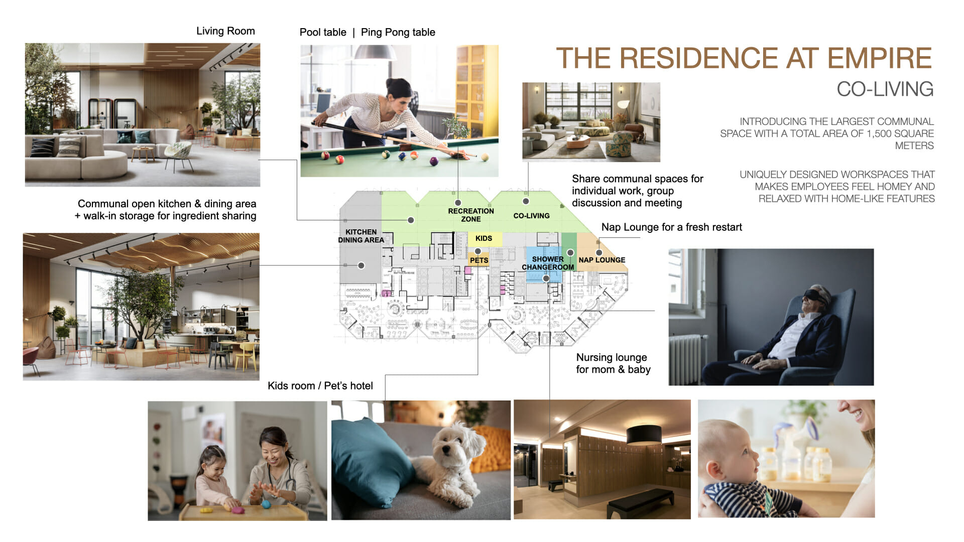 ทั้งนี้เอ็มไพร์ได้เตรียมพื้นที่กว่า 1,500 ตารางเมตร บนชั้น 53 สร้าง The Residence at Empire Co-living พื้นที่ทำงานซึ่งเป็นบริการพิเศษสำหรับผู้เช่า มีการออกแบบตกแต่งที่เป็นเอกลักษณ์เฉพาะตัวให้มีบรรยากาศเหมือนบ้านอันอบอุ่นและผ่อนคลาย ด้วยองค์ประกอบต่าง ๆ เช่น ห้องนั่งเล่น พื้นที่สันทนาการเพื่อการพักผ่อน เพลิดเพลินกับเกมคอนโซล โต๊ะพูล และโต๊ะปิงปอง ห้องครัวแบบเปิดส่วนกลาง และพื้นที่รับประทานอาหาร ห้องสำหรับเด็ก และพื้นที่สำหรับสัตว์เลี้ยง ห้องเปลี่ยนผ้าอ้อม สำหรับโซนพื้นที่ทำงานร่วมกัน ประกอบด้วยพื้นที่ส่วนกลาง และพื้นที่ทำงานส่วนตัว พื้นที่สำหรับสนทนากลุ่มและประชุม ตลอดจนโซนเพื่อการผ่อนคลายร่างกายและจิตใจ ประกอบด้วย Nap Lounge สำหรับการพักผ่อนเติมพลัง ห้องอาบน้ำ และห้องเปลี่ยนเสื้อผ้า