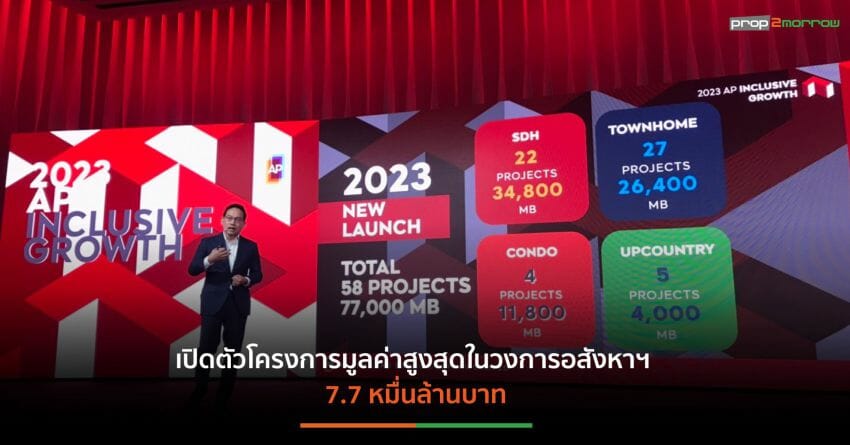 เอพีฯ มั่นใจอสังหาฯปี 66 ฟื้นตัว ต้อนรับศักราชใหม่ภายใต้แผน “2023 AP INCLUSIVE GROWTH ที่สุดของปีกับการเติบโตร่วมกัน” ผ่าน 3 มิติ สร้างประวัติศาสตร์ปีนี้ผุด 58 โครงการใหม่ มูลค่ากว่า 77,000 ล้านบาท ทั้งปีปูพรมรวม 192 โครงการทั่วไทย มูลค่าพร้อมขายกว่า 165,600 ล้านบาท ตั้งเป้ายอดขาย 58,000 ล้านบาท และเป้ารับรู้รายได้ 57,500 ล้านบาท ตั้งเป้างบซื้อที่ดินไว้ที่ 20,000 ล้านบาท พร้อมต่อยอดความเชี่ยวชาญรุกช่องว่างตลาดใหม่อีก 2-3 ธุรกิจ