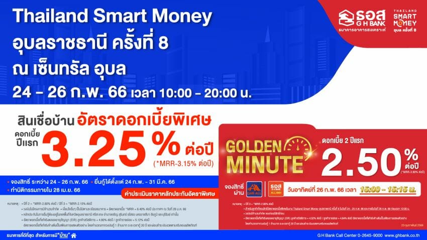 ธนาคารอาคารสงเคราะห์ (ธอส.) จัดโปรโมชั่นเด็ดตะลุยแดนอีสาน ในงาน “Thailand Smart Money อุบลราชธานี ครั้งที่ 8” ด้วยการนำผลิตภัณฑ์ทางการเงินของธนาคาร นำโดย สินเชื่อบ้านอัตราดอกเบี้ยต่ำ ปีที่ 1 เท่ากับ MRR-3.15% (ปัจจุบันเท่ากับ 3.25%) ต่อปี เฉลี่ย 3 ปีแรกเพียง 3.70% (อัตราดอกเบี้ย MRR ของ ธอส.ในปัจจุบันเท่ากับ 6.40% ต่อปี) ผ่อนชำระนานสูงสุดถึง 40 ปี ให้กู้ครอบคลุมทุกวัตถุประสงค์หลัก อาทิ ซื้อบ้าน/คอนโดมิเนียม ปลูกสร้าง และรีไฟแนนซ์ หลักประกันในการยื่นคำขอกู้ต้องอยู่ในพื้นที่จังหวัดอุบลราชธานี และพื้นที่ใกล้เคียง จองสิทธิ์ภายในงาน ยื่นกู้ตั้งแต่วันที่ 24 กุมภาพันธ์ – 31มีนาคม 2566 อนุมัติและทำนิติกรรมภายในวันที่ 28 เมษายน 2566 พิเศษ!! ผู้ที่จองสิทธิ์ยังมีโอกาสได้ลุ้นโปรโมชั่นพิเศษกับช่วง Golden Minute อัตราดอกเบี้ยต่ำปีที่ 1 – 2 เพียง MRR-3.90% ต่อปี (ปัจจุบันเท่ากับ 2.50% ต่อปี) ในวันอาทิตย์ที่ 26 กุมภาพันธ์ 2566 เวลา 15.00-15.15 น. (วงเงินมีจำนวนจำกัด)