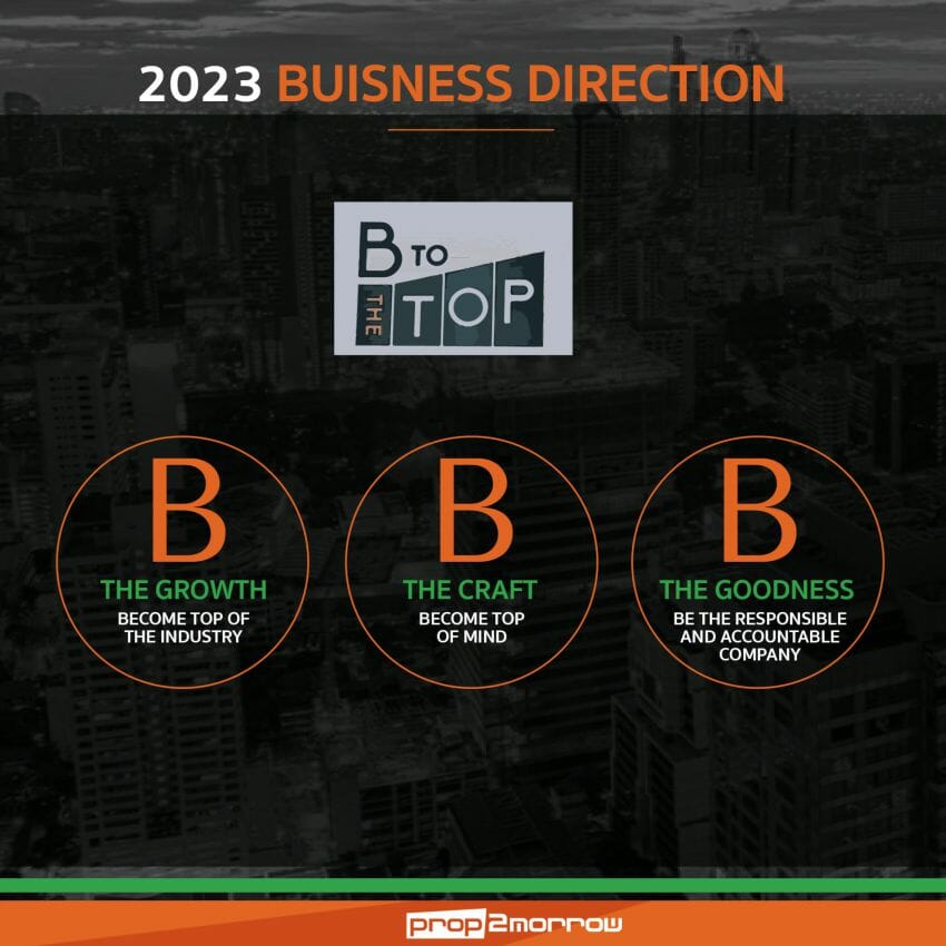 โดยในปี 2566 บริษัทวางแผนเดินหน้าพัฒนาธุรกิจภายใต้กลยุทธ์ “B To The Top” โดยวางแผนนำพาองค์กรเติบโตสู่ระดับท็อปของตลาดด้วยการเปิดตัวโครงการใหม่มากที่สุดนับตั้งแต่ก่อตั้งบริษัทจำนวน 20 โครงการ มูลค่าโครงการรวม 22,500 ล้านบาท แบ่งเป็นโครงการแบรนด์บริทาเนีย 12โครงการ แบรนด์แกรนด์ บริทาเนีย 4โครงการ แบรนด์เบลกราเวีย 2 โครงการ และแบรนด์ไบรตัน 2 โครงการ