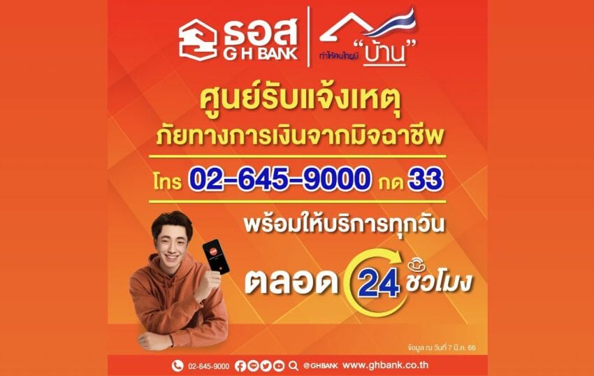 นายณรงค์พล ประภานิรินธน์ รักษาการผู้ช่วยกรรมการผู้จัดการ สายงานสื่อสารและภาพลักษณ์องค์กร ธนาคารอาคารสงเคราะห์ (ธอส.) เปิดเผยว่า เพื่อเป็นการร่วมสนับสนุนนโยบายของรัฐบาลและธนาคารแห่งประเทศไทยในการเร่งแก้ไขปัญหามิจฉาชีพหลอกลวงประชาชนผ่านช่องทางออนไลน์ ซึ่งเป็นเหตุให้มีผู้ที่หลงเชื่อต้องสูญเสียทรัพย์สินโดยไม่รู้ตัว ธอส. จึงเปิด ศูนย์รับแจ้งเหตุภัยทางการเงินจากมิจฉาชีพ โดยสามารถแจ้งเหตุได้ที่ G H Bank Call Center โทร. 02-645-9000 กด 33 เพื่อเป็นช่องทางด่วนในการช่วยเหลือและอำนวยความสะดวกให้แก่ลูกค้า ประชาชนสามารถโทรแจ้งเหตุมายังธนาคารได้ ทุกวันตลอด 24 ชั่วโมง โดยทันทีที่ลูกค้าพบว่าบัญชีเงินฝากธนาคารอาคารสงเคราะห์ของตนเองเกิดธุรกรรมที่ผิดปกติ มีการโอนเงินออกจากบัญชีโดยที่ตนเองไม่ใช่ผู้ทำธุรกรรม หรือสงสัยว่าตนเองมีความเสี่ยงจากการถูกล่อลวงให้ตกเป็นเหยื่อของมิจฉาชีพ สามารถโทรติดต่อที่ ศูนย์รับแจ้งเหตุภัยทางการเงินจากมิจฉาชีพ ของ ธอส. ได้ทันทีเพื่อระงับการทำธุรกรรม สกัดกั้นและบรรเทาความเสียหายที่อาจจะเกิดขึ้นโดยเร็วที่สุด