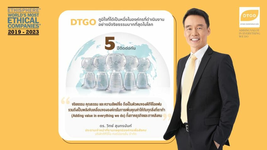DTGO ได้รับเลือกจากสถาบัน Ethisphere ผู้นำระดับโลกในการกำหนดและพัฒนามาตรฐานการดำเนินธุรกิจอย่างมีจริยธรรมให้เป็นหนึ่งในองค์กรที่ดำเนินงานอย่างมีจริยธรรมมากที่สุดในโลกประจำปี 2023 หรือ “2023 World’s Most Ethical Companies” เป็นองค์กรแห่งแรกในไทยที่ได้รับการคัดเลือกติดต่อกันถึง 5 ปีซ้อน ซึ่งมีองค์กรที่ได้รับการคัดเลือกให้เป็นองค์กรที่ดำเนินธุรกิจอย่างมีจริยธรรมทั้งสิ้น 135 องค์กร จาก 19 ประเทศ และ 46 กลุ่มอุตสาหกรรม