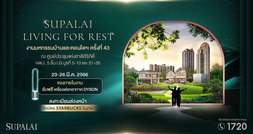 บริษัท ศุภาลัย จำกัด (มหาชน) นำบ้านและคอนโดมิเนียมราคาพิเศษเริ่มต้น 1.09 ล้านบาท ร่วมงานมหกรรมบ้านและคอนโดฯ ครั้งที่ 43 ในระหว่างวันที่ 23 – 26 มีนาคม 2566 ณ ศูนย์การประชุมแห่งชาติสิริกิติ์ พร้อมจัดแคมเปญ “SUPALAI LIVING FOR REST” จองภายในงานรับฟรีเครื่องฟอกอากาศ Dyson รุ่น TP00 อีกทั้งลูกค้าสามารถลงทะเบียนก่อนวันงานผ่าน www.supalai.com หรือ http://bit.ly/3YDCXMD เพื่อรับสิทธิพิเศษภายในงานถึง 2 ต่อ คือ รับบัตรกำนัล Starbucks มูลค่า 100 บาทฟรี และรับทันทีส่วนลดเพิ่มเติมอีก 5,000 บาท สำหรับลูกค้าที่จองเฉพาะในบูธศุภาลัยเท่านั้น