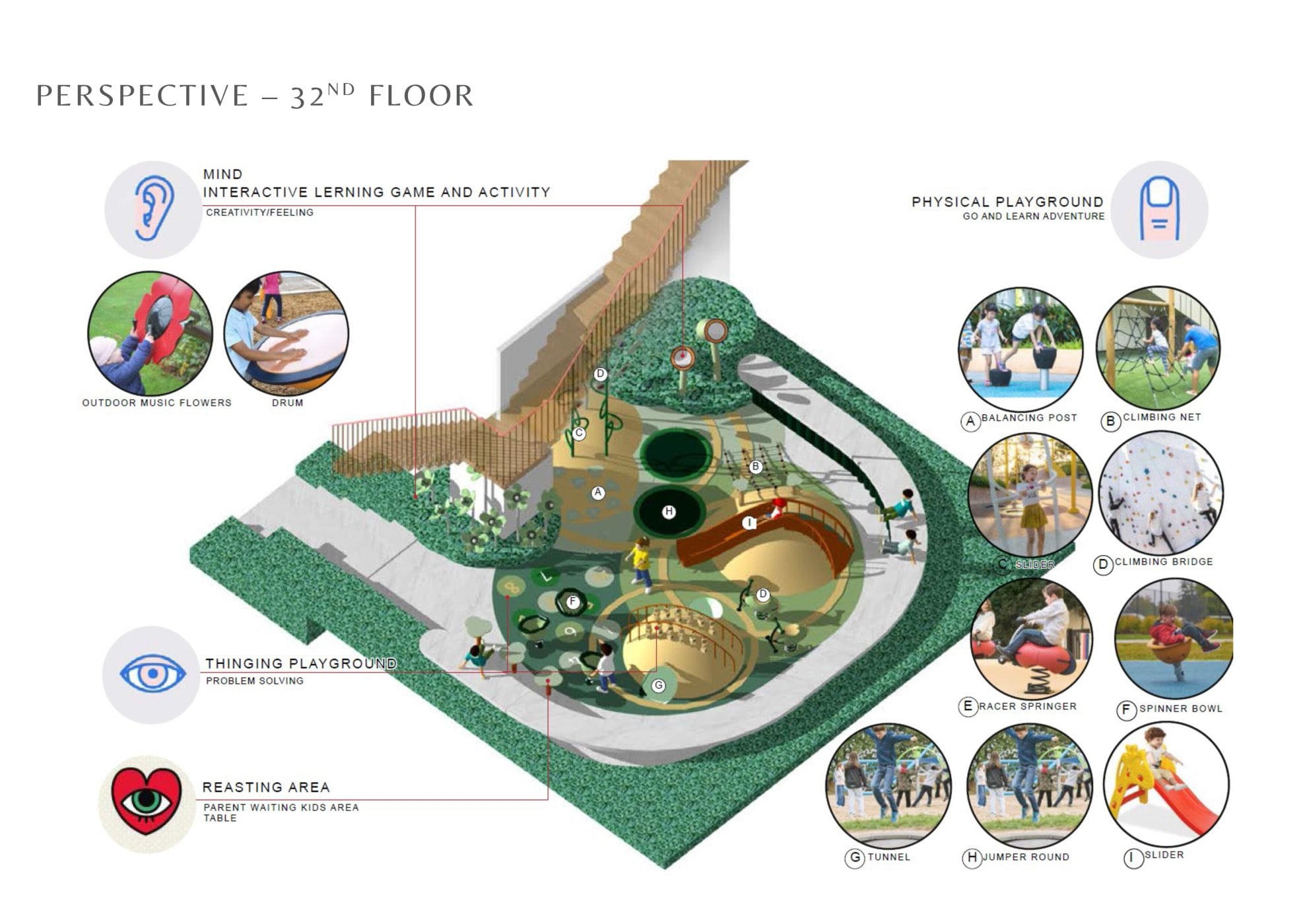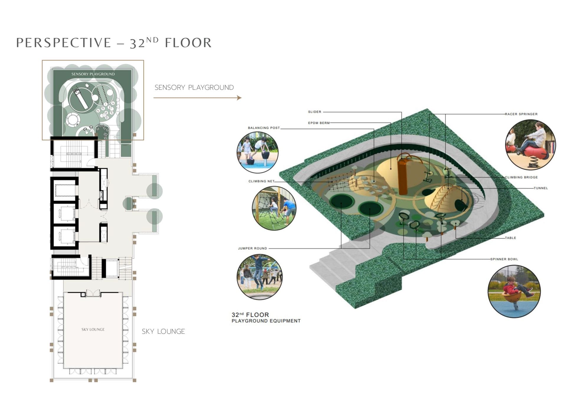 ชั้น 32 เป็นส่วน Sky Lounge Sunset Seat และ Sensory Playground สนามเด็กเล่นที่ออกแบบให้เด็กๆ สามารถเชื่อมโยงการรับรู้กับประสาทสัมผัส ส่งเสริมประสบการณ์ที่ดี และยังได้สนุกสนานไปกับการเรียนรู้สิ่งต่างๆ รอบตัวอีกด้วย
