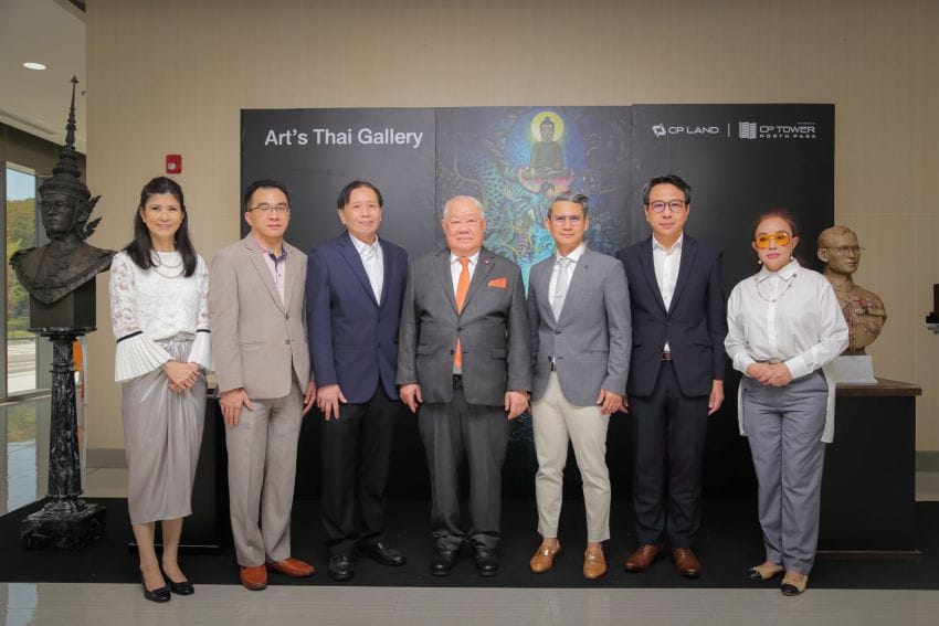 นายสุนทร อรุณานนท์ชัย (กลาง) รองประธานกรรมการ ,นายกีรติ ศตะสุข (ที่ 3 จากขวา) ประธานเจ้าหน้าที่บริหาร ,นายกนธีร์ ติรวิภาส (ที่ 3 จากซ้าย) รองประธาน คณะกรรมการกลั่นกรองการลงทุนและพัฒนาโครงการ บริษัท ซี.พี.แลนด์ จำกัด (มหาชน) หรือ CPLAND ให้เกียรติเป็นประธานในพิธีเปิดงาน “Art’s Thai Gallery” ณ อาคาร ซี.พี.ทาวเวอร์ นอร์ธปาร์ค (CP Tower North Park) ตั้งอยู่ในโครงการนอร์ธปาร์ค บนถนนวิภาวดี-รังสิต แขวงทุ่งสองห้อง เขตหลักสี่ กรุงเทพฯ เมื่อเร็วๆนี้
