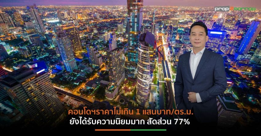 ไตรมาสที่ 1 ..2566 คอนโดมิเนียมที่เปิดขายในราคาไม่เกิน 100,000 บาทต่อตารางเมตรยังคงมีสัดส่วนที่มากกว่าคอนโดมิเนียมในระดับราคาอื่นแบบชัดเจน โดยมีสัดส่วนประมาณ 77% เมื่อเทียบกับคอนโดมิเนียมในระดับราคาต่างๆ ซึ่งส่งผลให้ราคาขายเฉลี่ยคอนโดมิเนียมที่เปิดขายใหม่ในไตรมาสที่ 1 ..2566 มีราคาขายเฉลี่ยลดลงจากไตรมาสก่อนหน้านี้เล็กน้อย ในขณะที่ถ้าพิจารณาเฉพาะคอนโดมิเนียมในระดับราคาต่ำกว่า 100,000 บาทต่อตารางเมตร จะพบว่าคอนโดมิเนียมในระดับราคาต่ำกว่า 70,000 บาทต่อตารางเมตรมีสัดส่วนมากถึง 51% จากจำนวนทั้งหมด 3,810 ยูนิต