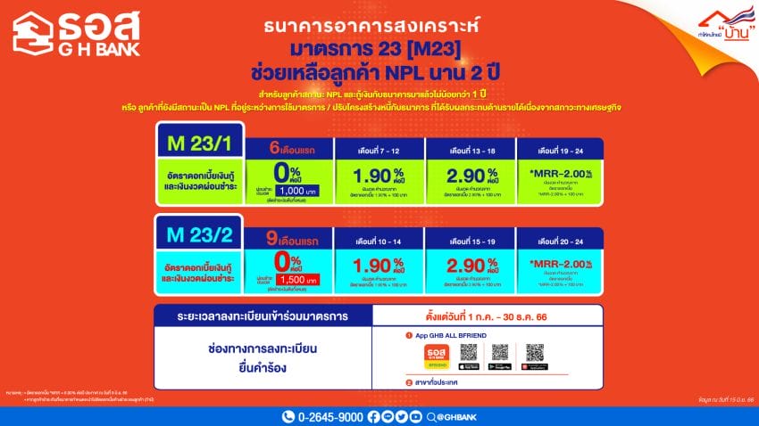 ธนาคารอาคารสงเคราะห์ (ธอส.) ประกาศขยายเวลาลงทะเบียนมาตรการ 23 [M23] : สำหรับลูกค้าสถานะ NPL ที่กู้เงินกับธนาคารมาแล้วไม่น้อยกว่า 1 ปี หรือลูกค้าที่มีสถานะเป็น NPL ที่อยู่ระหว่างการใช้มาตรการช่วยเหลือหรืออยู่ระหว่างการปรับโครงสร้างหนี้ของธนาคาร ที่ยังได้รับผลกระทบด้านรายได้จาก COVID-19 หรือสภาวะเศรษฐกิจ ให้ได้รับความช่วยเหลืออย่างต่อเนื่อง โดยให้สามารถลงทะเบียนเข้าร่วมมาตรการได้อีก 6 เดือน หรือตั้งแต่วันที่ 1 กรกฎาคม – 30 ธันวาคม 2566 จากเดิมสิ้นสุดระยะเวลาลงทะเบียนถึงวันที่ 30 มิถุนายน 2566 โดยลูกค้าที่เข้าร่วม M23 สามารถเลือกรับความช่วยเหลือตามความสามารถในการผ่อนชำระได้นานสูงสุด 2 ปี แบ่งออกเป็น 2 แนวทาง ประกอบด้วย