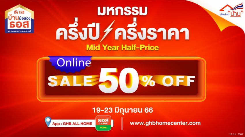 ธอส. จัดงานมหกรรมครึ่งปี – ครึ่งราคา : MID YEAR Half – Price Sale จำหน่ายบ้านมือสองผ่านระบบออนไลน์ ลดราคาถึง 50% มากกว่า 100 รายการ