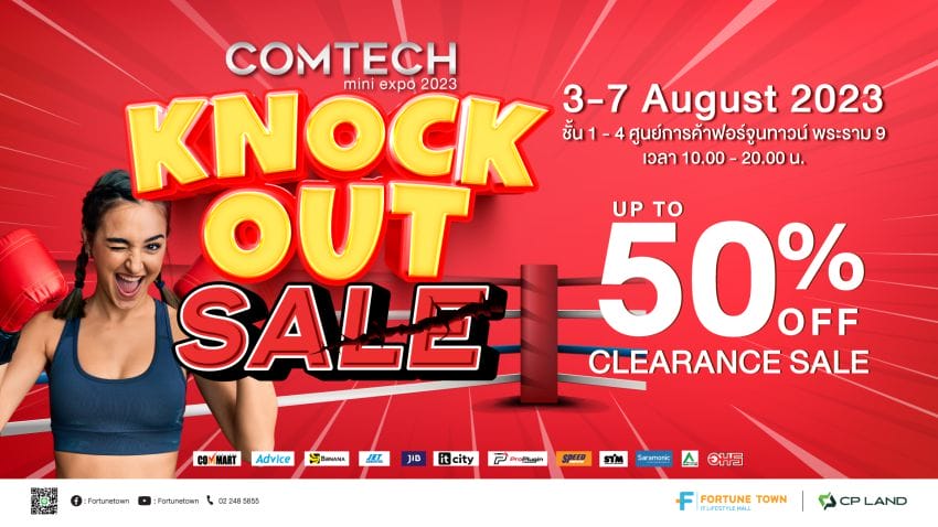 กลับมาอีกครั้งกับมหกรรมลดหนักจัดเต็ม Knock Out Sale ฟอร์จูนทาวน์ เอาใจสาวกชาวไอที จับมือพันธมิตร Commart แบรนด์ไอทีชั้นนำ ได้แก่ Advice, Banana, JIB, JET COMPUTER, IT City, ProPlugin, Speed, อมร อีเล็คโทรนิคส์, เดอะดิจิตอลเอสทีเอ็ม, Saramonic และร้านค้าในฟอร์จูนทาวน์ เปิดคลังขนทัพสินค้าจากแบรนด์ชั้นนำ ลดราคาแบบจัดเต็ม ในงาน COMTECH MINI EXPO 2023 @ Fortune Town อัดแน่นไปด้วยสินค้าไอทีชั้นนำ ลดสูงสุด 50% ให้ได้ช้อปกับสินค้าคุณภาพ อาทิ คอมพิวเตอร์ โน้ตบุ๊ก เครื่องปรินต์ อุปกรณ์ไอที เครื่องใช้ไฟฟ้า เป็นต้น นอกจากนี้ฟอร์จูนทาวน์ ยังเปิดพื้นที่กิจกรรมให้ทาง ProPlugin ร้านมัลติแบรนด์ ด้านอุปกรณ์ดนตรี ที่พร้อมจะปลดล็อกทุกข้อจำกัดทางดนตรีของคุณกับ Experience Zone เปิดประสบการณ์ด้านดนตรีแบบใกล้ชิด Activity Zone โชว์ความสามารถด้านดนตรีในรูปแบบ Fusion Music และ Clearance Zone สินค้าลดราคาพิเศษกว่า 70% และกิจกรรมอื่น ๆ มากมายภายในงาน