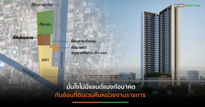 ดังนั้นทางเข้า-ออกเดิม ติดถนนลาดพร้าวมาโดยตลอด ไม่มีประเด็นใดๆที่เป็นที่ดินตาบอด หลังจากนั้นก็มีพระราชกฤษฎีกา (พ.ร.ฎ.)เวนคืนที่ดิน ในลักษณะของที่ดินสีเหลือง ที่เตรียมเพื่อจะสร้างทางขึ้นลง รถไฟฟ้าใต้ดินสถานีรัชดาฯ และอาคารจอดแล้วจร แห่งแรก เพราะในอดีตรัชดาฯถือว่าเป็นที่ดินท้องนา นอกเมืองมาก  พอปี 2547 เป็นปีที่อาคารจอดแล้วจรสร้างแล้วเสร็จและเปิดให้บริการ เป็นระยะเวลาที่เกิดขึ้นก่อนการพัฒนาโครงการดังกล่าว ก่อนที่บริษัทฯจะเป็นเจ้าของที่ดินแปลงดังกล่าว และปี 2557 เจ้าของที่ดินเดิม ได้ขอทางเข้าออกจาก การรถไฟฟ้าขนส่งมวลชนแห่งประเทศไทย (รฟม.) และใช้อำนาจที่ตนเองมี ก็ให้ทางออก แต่ขอเป็นในรูปแบบให้จ่ายค่าตอบแทนกลับ โดยเป็นการจ่ายเพียงครั้งเดียว ปัจจุบันโครงการดังกล่าวมียอดขายแล้วกว่า 80% หรือมูลค่าประมาณ 1,600 ล้านบาท จากมูลค่าโครงการรวมประมาณ 2,000 ล้านบาท ซึ่งเตรียมโอนให้กับลูกค้าในช่วงต้นปี 2567” นายธงชัย กล่าว