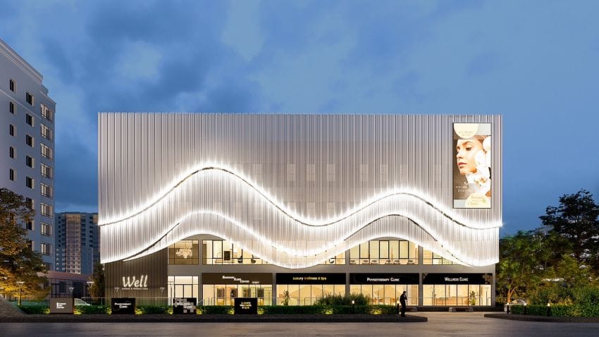 สำหรับ Well Aesthetic & Wellness Center เป็นอาคารสูง 4 ชั้น ออกแบบภายใต้แนวคิด “Moving Forword for Wellbeing” เน้นเส้นสายและลวดลายที่มี Movement สะท้อนถึงความไม่หยุดนิ่งด้วยเทคโนโลยีและนวัตกรรมทางการแพทย์ที่ทันสมัย และแสดงถึงความอ่อนโยน นุ่มนวล ซึ่งสะท้อนถึงความเป็นมิตร และการให้บริการที่เข้าใจถึงความต้องการของลูกค้า เดินทางสะดวกทั้งรถยนต์ส่วนตัว และรถไฟฟ้า MRT ถึง 2 สาย คือ MRT สายสีน้ำเงิน และสายสีเหลือง สถานีลาดพร้าว